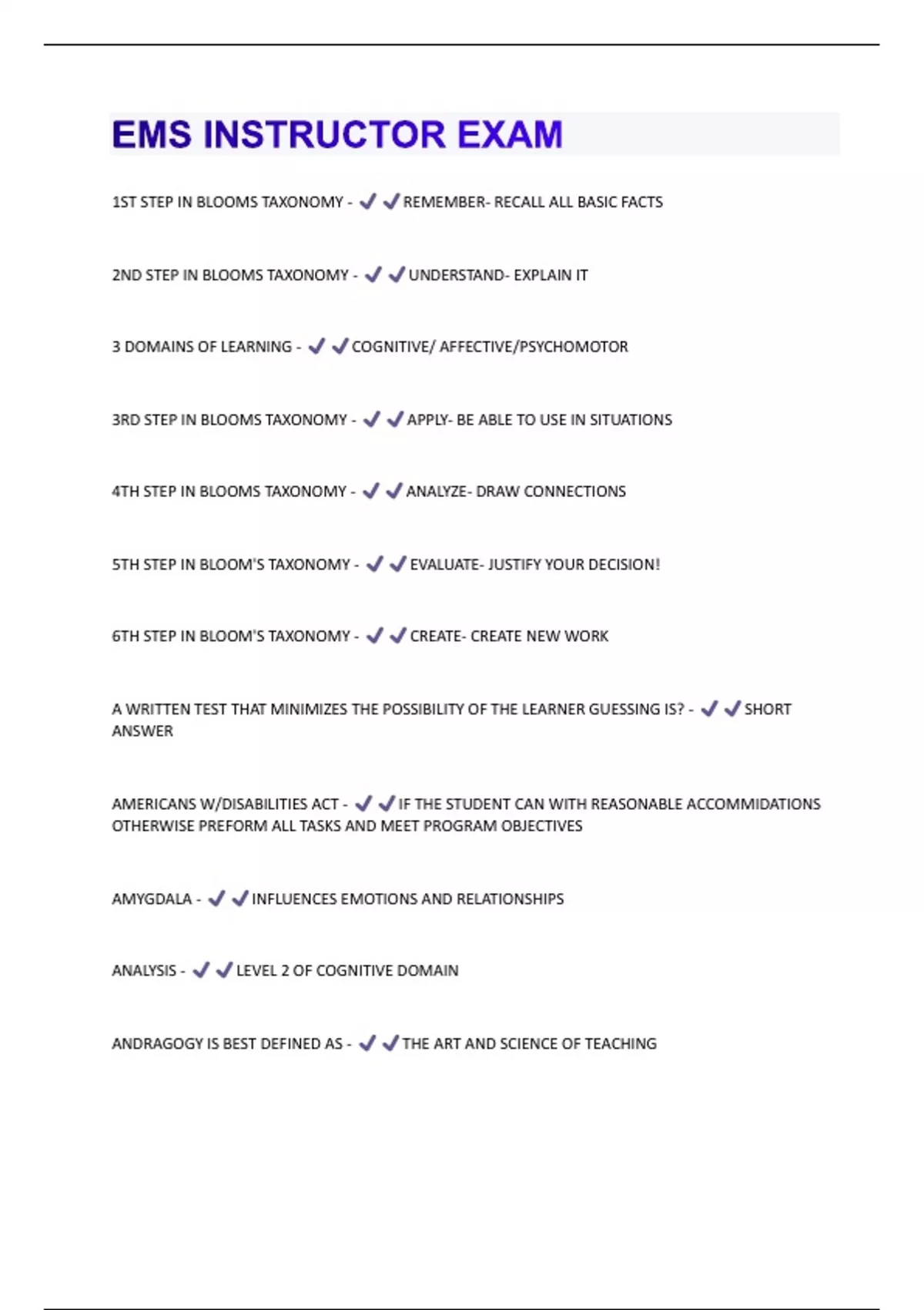 1ST STEP IN BLOOMS TAXONOMY - REMEMBER- RECALL ALL BASIC FACTS 2ND STEP IN BLOOMS TAXONOMY - UNDERSTAND- EXPLAIN IT 3 DOMAINS OF LEARNING - COGNITIVE/ AFFECTIVE/PSYCHOMOTOR 3RD STEP IN BLOOMS TAXONOMY - APPLY- BE ABLE TO USE IN SITUATIONS 4TH STEP IN BLOOMS TAXONOMY - ANALYZE- DRAW CONNECTIONS 5TH STEP IN BLOOM'S TAXONOMY - EVALUATE- JUSTIFY YOUR DECISION! 6TH STEP IN BLOOM'S TAXONOMY - CREATE- CREATE NEW WORK A WRITTEN TEST THAT MINIMIZES THE POSSIBILITY OF THE LEARNER GUESSING IS? - SHORT ANSWER AMERICANS W/DISABILITIES ACT - IF THE STUDENT CAN WITH REASONABLE ACCOMMIDATIONS OTHERWISE PREFORM ALL TASKS AND MEET PROGRAM OBJECTIVES AMYGDALA - INFLUENCES EMOTIONS AND RELATIONSHIPS ANALYSIS - LEVEL 2 OF COGNITIVE DOMAIN ANDRAGOGY IS BEST DEFINED AS - THE ART AND SCIENCE OF TEACHINGARTICULATION AND NATURALIZATION - LEVEL 3 OF PSYCHOMOTOR DOMAIN BEHAVIORAL OBJECTIVES - TOOLS THAT INSTRUCTOR USES TO WRITE, TEACH AND TO EVALUATE A COURSE BEST EXAMPLE OF REMEDIATION - FORMATIVE EVALUATION REVIEWING AREAS OF DEFICIENCIES BLOOM'S TAXONOMY - KNOWLEDGE, UNDERSTANDING, UNDERSTANDING AND APPLICATION CEREBELLUM - BALANCE AND COORDINATION CEREBRAL CORTEX - RESPONSIBLE FOR CREATIVITY, PLANNING, LANGUAGE AND PERCEPTION COMMON AFFECTIVE VERBS - DEFEND, VALUE, MODEL, APPRECIATE COMMON COGNITIVE VERBS - DEFINE, KNOW, DESCRIBE, ANALYZE, DISCUSS COMMON PSYCHOMOTOR VERBS - DEMONSTRATE, SHOW, PERFORM, CONDUCT CONTENT VALIDITY - ASSURING AN EXAM COVERS A REASONABLE SAMPLE OF KNOWLEDGE AND SKILL OBJECTIVES EQUAL OPPORTUNITY STATEMENT - PROGRAM'S COMMITMENT TO NONDISCRIMINATORY PRACTICES ETHICS - THE STUDY OF "RIGHT" ACTIONS EXTRINSIC MOTIVATION - COMES FROM OUTSIDE OF INDIVIDUALFORMAL EVALUATION - STRUCTURED INSTRUMENT TO ASSESS STUDENT ATTAINMENT FORMATIVE EVALUATION - ONGOING EVALUATION OF THE STUDENTS AND INSTRUCTION THROUGHOUT THE COURSE FRONTAL LOBE - CONTROL CENTER OF BRAIN