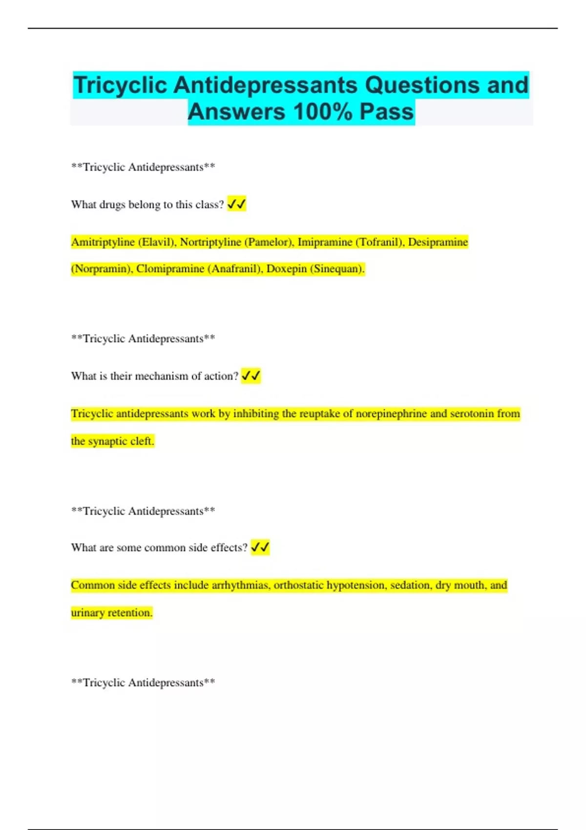 Tricyclic Antidepressants Questions and Answers 100% Pass