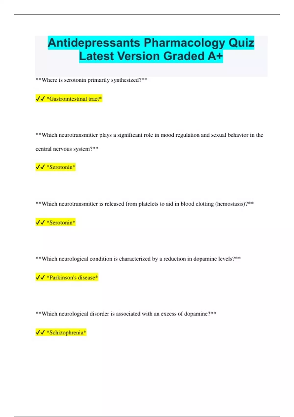 Antidepressants Pharmacology Quiz Latest Version Graded A+ **Where is serotonin primarily synthesized?** *Gastrointestinal tract* **Which neurotransmitter plays a significant role in mood regulation and sexual behavior in the central nervous system?** *Serotonin* **Which neurotransmitter is released from platelets to aid in blood clotting (hemostasis)?** *Serotonin* **Which neurological condition is characterized by a reduction in dopamine levels?** *Parkinson's disease* **Which neurological disorder is associated with an excess of dopamine?** *Schizophrenia* **Which neurotransmitter is responsible for regulating prolactin secretion from the pituitary gland?** *Dopamine* **Which neurotransmitter triggers the release of norepinephrine and epinephrine (adrenaline)?** *Dopamine* **Does low or high concentration of dopamine cause vasodilation?** *Low concentration* **Does low or high concentration of dopamine cause vasoconstriction?** *High concentration* **Which neurotransmitter is recommended in septic shock or acute heart failure to enhance vasoconstriction?** *Dopamine OR Norepinephrine (alpha-1 adrenergic agonist)* **Through which receptors does norepinephrine stimulate vasoconstriction?** *Alpha 1 receptors* **Which neurotransmitter is associated with the body's response in "fight or flight" situations?** *Norepinephrine*