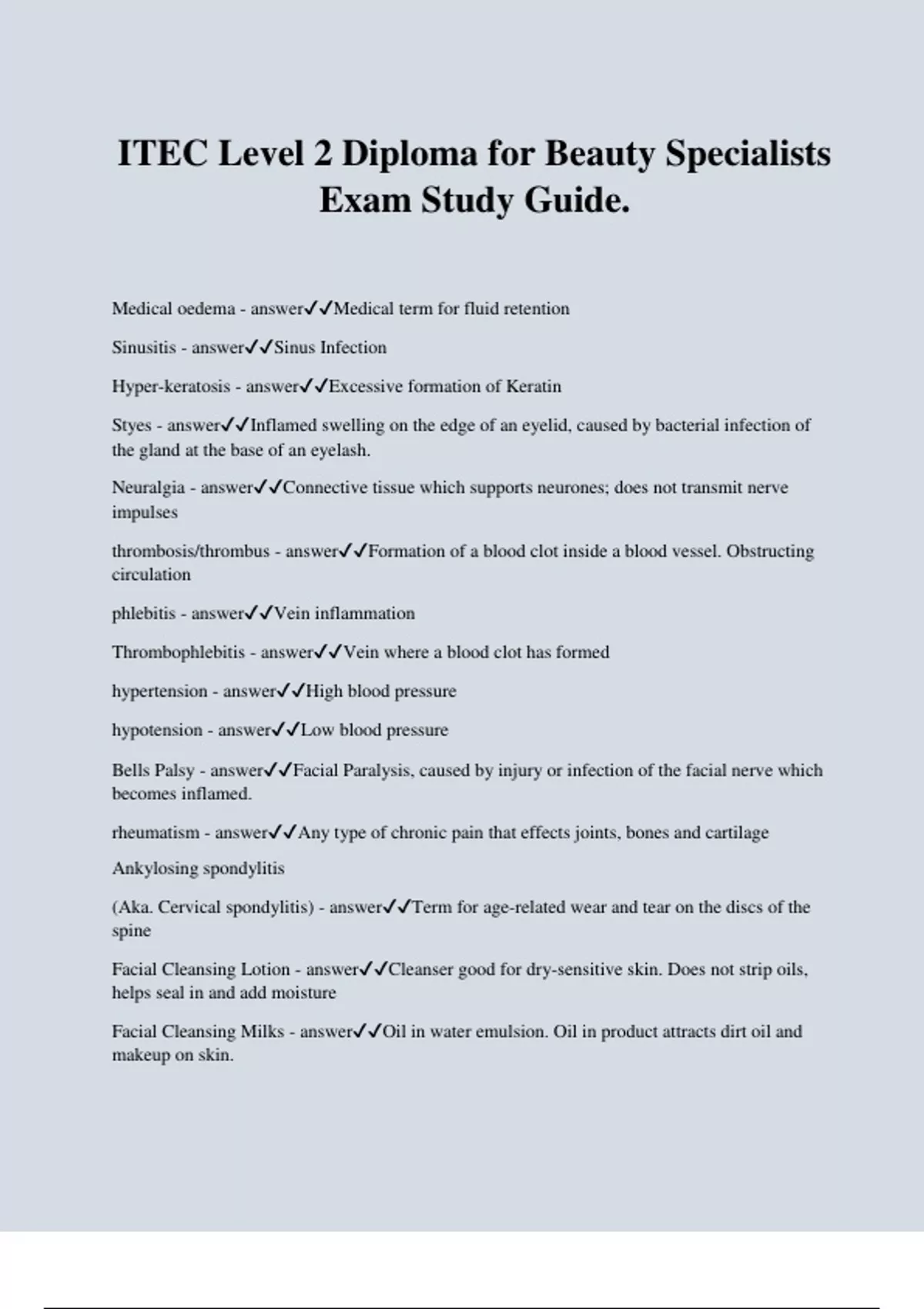 ITEC Level 2 Diploma for Beauty Specialists Exam Study Guide. Medical oedema - answerMedical term for fluid retention Sinusitis - answerSinus Infection Hyper-keratosis - answerExcessive formation of Keratin Styes - answerInflamed swelling on the edge of an eyelid, caused by bacterial infection of the gland at the base of an eyelash. Neuralgia - answerConnective tissue which supports neurones; does not transmit nerve impulses thrombosis/thrombus - answerFormation of a blood clot inside a blood vessel. Obstructing circulation phlebitis - answerVein inflammation Thrombophlebitis - answerVein where a blood clot has formed hypertension - answerHigh blood pressure hypotension - answerLow blood pressure Bells Palsy - answerFacial Paralysis, caused by injury or infection of the facial nerve which becomes inflamed. rheumatism - answerAny type of chronic pain that effects joints, bones and cartilage Ankylosing spondylitis (Aka. Cervical spondylitis) - answerTerm for age-related wear and tear on the discs of the spine Facial Cleansing Lotion - answerCleanser good for dry-sensitive skin. Does not strip oils, helps seal in and add moisture Facial Cleansing Milks - answerOil in water emulsion. Oil in product attracts dirt oil and makeup on skin. Facial Foaming Cleansers - answercleanser that strips the skin of its natural oils. The most damaging on the skin Dermatosis papulosa nigra - answerAlso called flesh moles, brown or black hyper pigmentation resembling moles. Common on Black females. Pseudo folliculitis - answerRazor bumps Rosewater Toner - answerMildly astringent. Regular use of this toner can help prevent wrinkles (slowing down aging process), tighten pores and add a wonderful glow to the skin. Witchazel - answerReduces swelling, tightens pores. Great for psoriasis and eczema. Also treats insect bites, hemroids and poison ivy Orange Blossom Water - answerSuper gentle toner. Used in baby products in France. Stimulates healing, smoothest skin and reduces pore size. Scabies - answerSkin condition caused by a burrowing mite Atopic Dermatitis - answerAllergic inflammation, characterized by erythema, itching and various skin lesions. Many causes including plants, drugs, clothing, cosmetics and chemicals. Non-contagious. Atopic Eczema - answerFound all over the body mostly on the inside of the knees, elbow, joints, on the face, hands and scalp. Skin is extremely dry and itchy. Also has patches of scaly dry patches and sometimes bleeding. Non-contagious. Psoriasis - answerCondition in which skin cells build up and form scales and itchy dry patches Acne Vulgaris - answerSimply known as acne Bacterial infection - answerSingle celled microorganisms. Causes skin infection such as impetigo for acne Viral infection - answerCaused by micro-organisms smaller than bacteria. Does not respond to antibiotics. Reproduces inside human cells. Some examples are chickenpox, hepatitis and cold sores. Fungal infection - answerCaused by parasitic growth, which includes mounds, rusts, yeasts and mushrooms. Reproduces by spores. Examples are tinea and candida Ultraviolet Radiation (UV) - answerShort wave ultraviolet radiation can be used to sanitize small items such as brushes and electrodes. The item to be sanitized must be previously cleaned and free of debris. Items must be turned after roughly 20 minutes per side.