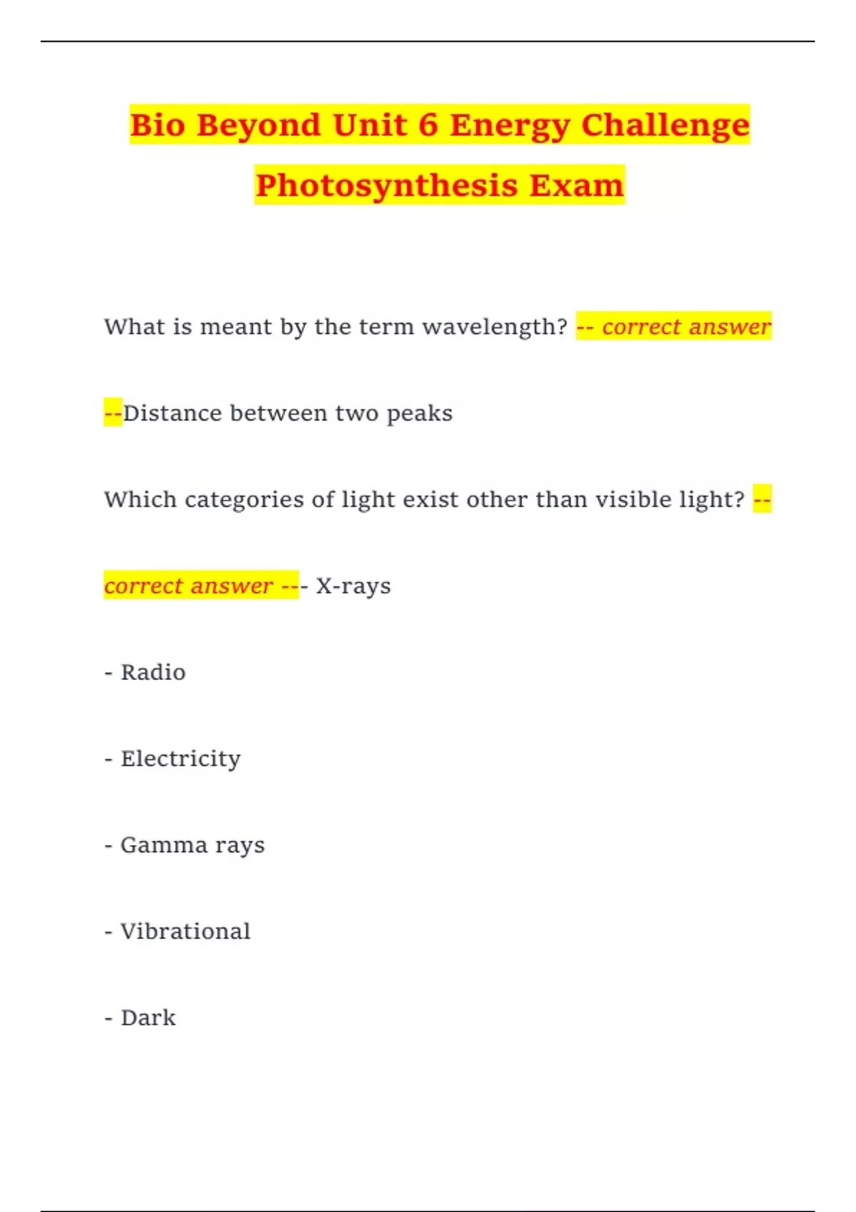 Bio Beyond Unit 6 Energy Challenge Photosynthesis Exam What is meant by the term wavelength? -- correct answer --Distance between two peaks