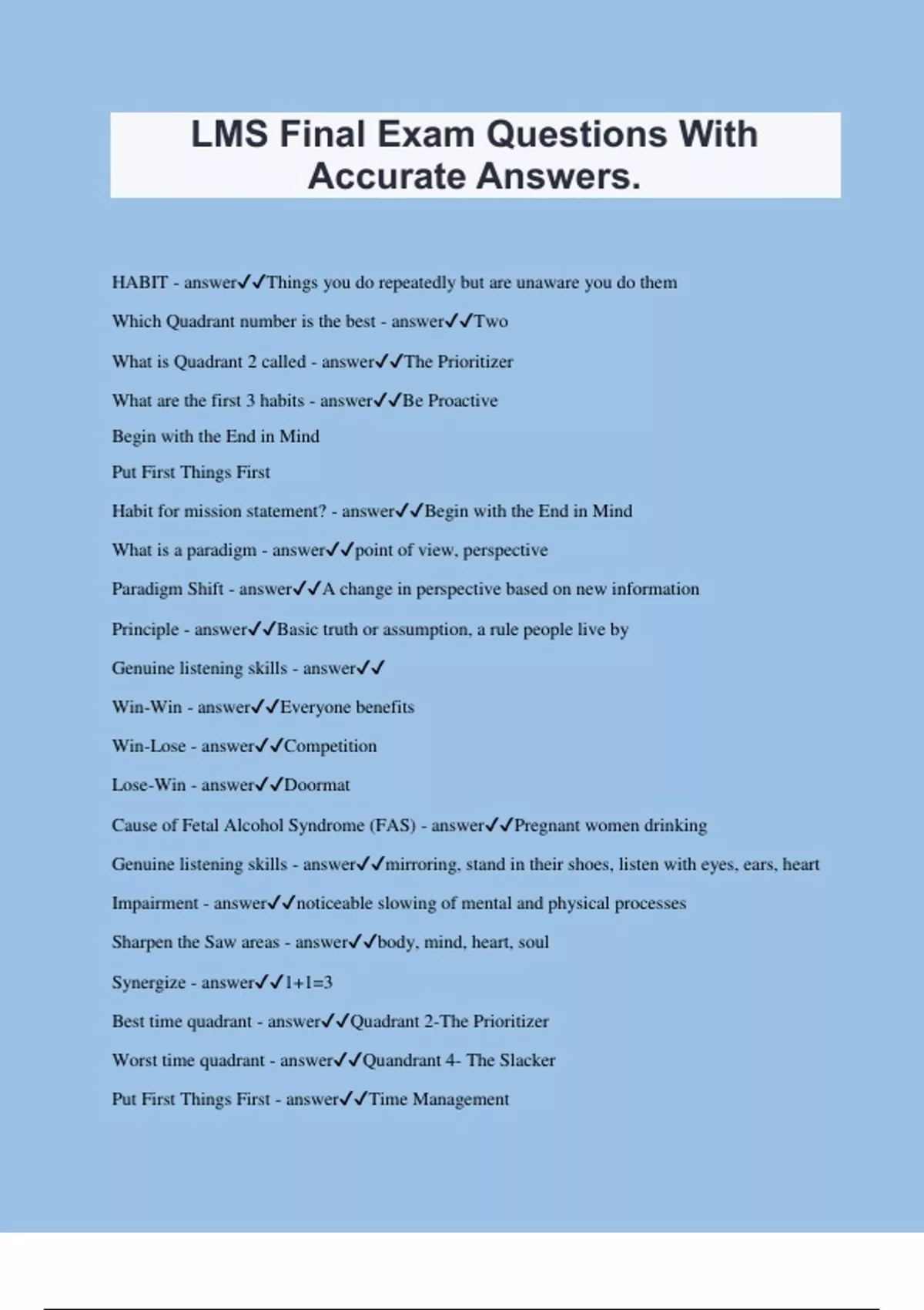 LMS Final Exam Questions With Accurate Answers. HABIT - answerThings you do repeatedly but are unaware you do them Which Quadrant number is the best - answerTwo What is Quadrant 2 called - answerThe Prioritizer What are the first 3 habits - answerBe Proactive Begin with the End in Mind Put First Things First Habit for mission statement? - answerBegin with the End in Mind What is a paradigm - answerpoint of view, perspective Paradigm Shift - answerA change in perspective based on new information Principle - answerBasic truth or assumption, a rule people live by Genuine listening skills - answer Win-Win - answerEveryone benefits Win-Lose - answerCompetition Lose-Win - answerDoormat Cause of Fetal Alcohol Syndrome (FAS) - answerPregnant women drinking Genuine listening skills - answermirroring, stand in their shoes, listen with eyes, ears, heart Impairment - answernoticeable slowing of mental and physical processes Sharpen the Saw areas - answerbody, mind, heart, soul Synergize - answer1+1=3 Best time quadrant - answerQuadrant 2-The Prioritizer Worst time quadrant - answerQuandrant 4- The Slacker Put First Things First - answerTime Management