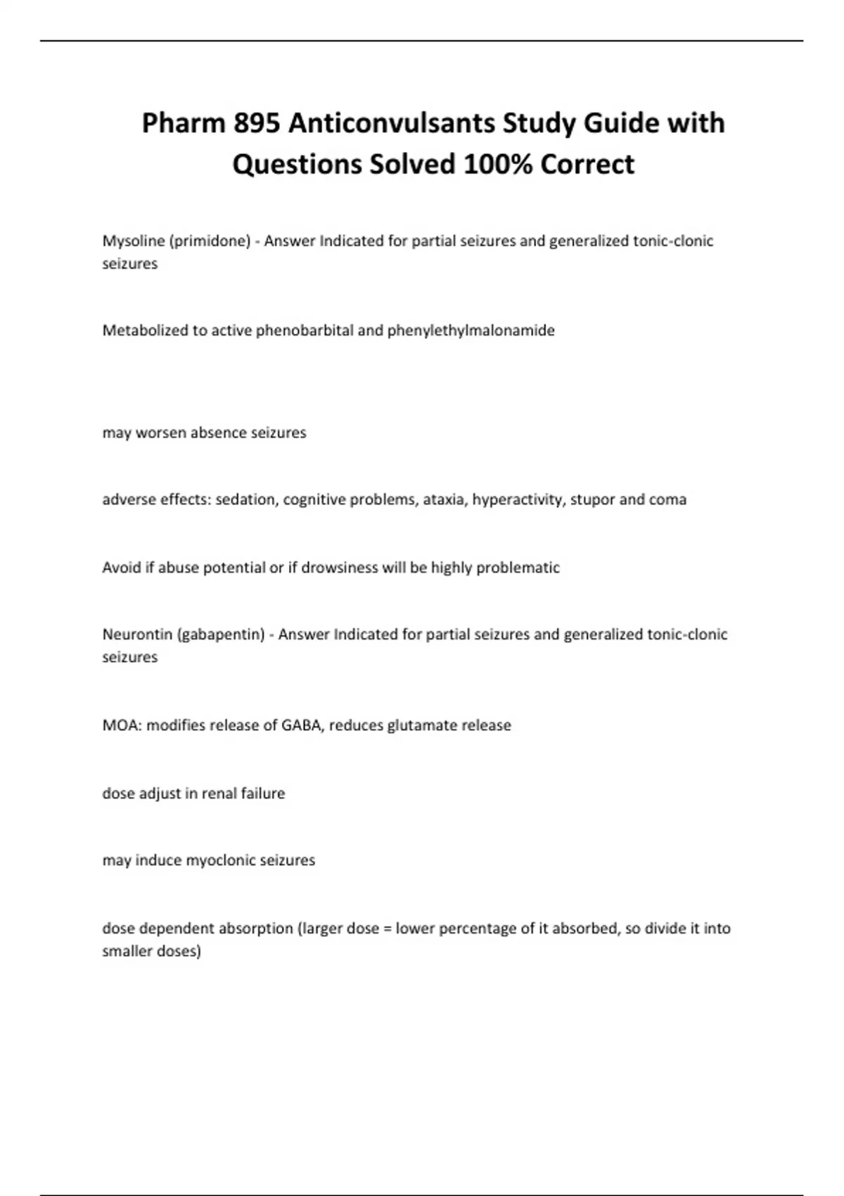 Pharm 895 Anticonvulsants Study Guide with Questions Solved 100% Correct