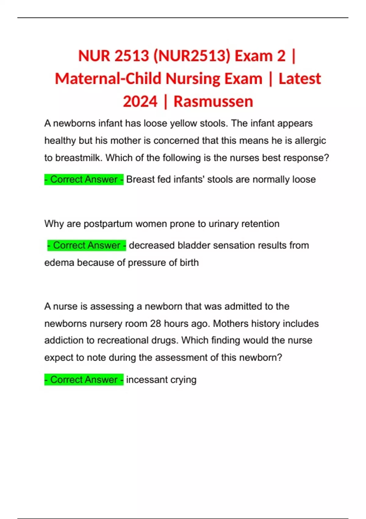 NUR 2513 (NUR2513) Exam 2 | Maternal-Child Nursing Exam | Latest 2024 | Rasmussen
