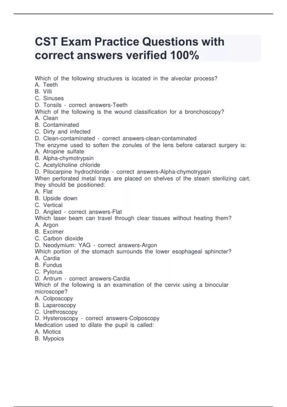 CST b Exam b Practice b Questions b with b correct b answers b verified b 100% Which b of b the b following b structures b is b located b in b the b alveolar b process? A. b Teeth B. b Villi C. b Sinuses D. b Tonsils b - b correct b answers-Teeth Which b of b the b following b is b the b wound b classification b for b a b bronchoscopy? A. b Clean B. b Contaminated C. b Dirty b and b infected D. b Clean-contaminated b - b correct b answers-clean-contaminated The b enzyme b used b to b soften b the b zonules b of b the b lens b before b cataract b surgery b is: A. b Atropine b sulfate B. b Alpha-chymotrypsin C. b Acetylcholine b chloride D. b Pilocarpine b hydrochloride b - b correct b answers-Alpha-chymotrypsin When b perforated b metal b trays b are b placed b on b shelves b of b the b steam b sterilizing b cart, b they b should b be b positioned: A. b Flat B. b Upside b down C. b Vertical D. b Angled b - b correct b answers-Flat Which b laser b beam b can b travel b through b clear b tissues b without b heating b them? A. b Argon B. b Excimer C. b Carbon b dioxide D. b Neodymium: b YAG b - b correct b answers-Argon Which b portion b of b the b stomach b surrounds b the b lower b esophageal b sphincter? A. b Cardia B. b Fundus C. b Pylorus D. b Antrum b - b correct b answers-Cardia Which b of b the b following b is b an b examination b of b the b cervix b using b a b binocular b microscope? A. b Colposcopy B. b Laparoscopy C. b Urethroscopy D. b Hysteroscopy b - b correct b answers-Colposcopy Medication b used b to b dilate b the b pupil b is b called: A. b Miotics B. b Mypoics C. b Mydriatics D. b Muscarinics b - b correct b answers-Mydriatics Which b of b the b following b is b an b abnormal b tract b between b two b epithelium-lined b surfaces b that b is b open b at b both b ends? A. b Epithelialization B. b Fistula C. b Herniation D. b Sinus b - b correct b answers-Fistula Which b of b the b following b directional b terms b describes b the b type b of b skin b prep b of b an b entire b extremity? A. b Spiral B. b Horizontal C. b Longitudinal D. b Circumferential b - b correct b answers-Circumferential Which b term b refers b to b an b abnormal b thoracic b curve b of b the b spine b referred b to b as b "hunchback"? A. b Lordosis B. b Scoliosis C. b Kyphosis D. b Alkalosis b - b correct b answers-Kyphosis What b is b the b medical b term b for b a b bunion? A. b Talipes b valgus B. b Hallux b valgus C. b Hallux b varus D. b Talipes b varus b - b correct b answers-Hallux b valgus How b is b the b surgical b informed b consent b signed b if b an b adult b patient b is b illiterate? A. b Authorized b individual b signs b patient's b name B. b Patient b marks b with b an b "X" b and b witness b verifies C. b RN b and b surgeon b sign b that b patient b gave b consent D. b Surgeon b and b Risk b Manager b sign b consent b - b correct b answers-Patient b marks b with b an b "X" b and b witness b verifies What b is b the b name b of b the b urinary b catheter b with b a b small, b curved b tapered b tip b used b on b patients b with b urethral b strictures? A. b Iglesias B. b Coude C. b Pigtail D. b Bonanno b - b correct b answers-Coude A b congenital b defect b in b which b the b fetal b blood b vessel b between b the b pulmonary b artery b and b aorta b does b not b close b is: A. b Coarctation b of b the b aorta B. b Patent b ductus b arteriosus C. b Tetralogy b of b Fallot D. b Ventricular b septal b defect b - b correct b answers-Patent b ductus b arteriosus What b is b the b surgical b position b commonly b used b for b thyroid b and b gallbladder b surgery? A. b Supine B. b Fowler's C. b Reverse b Trendelenburg download for correct and complete document