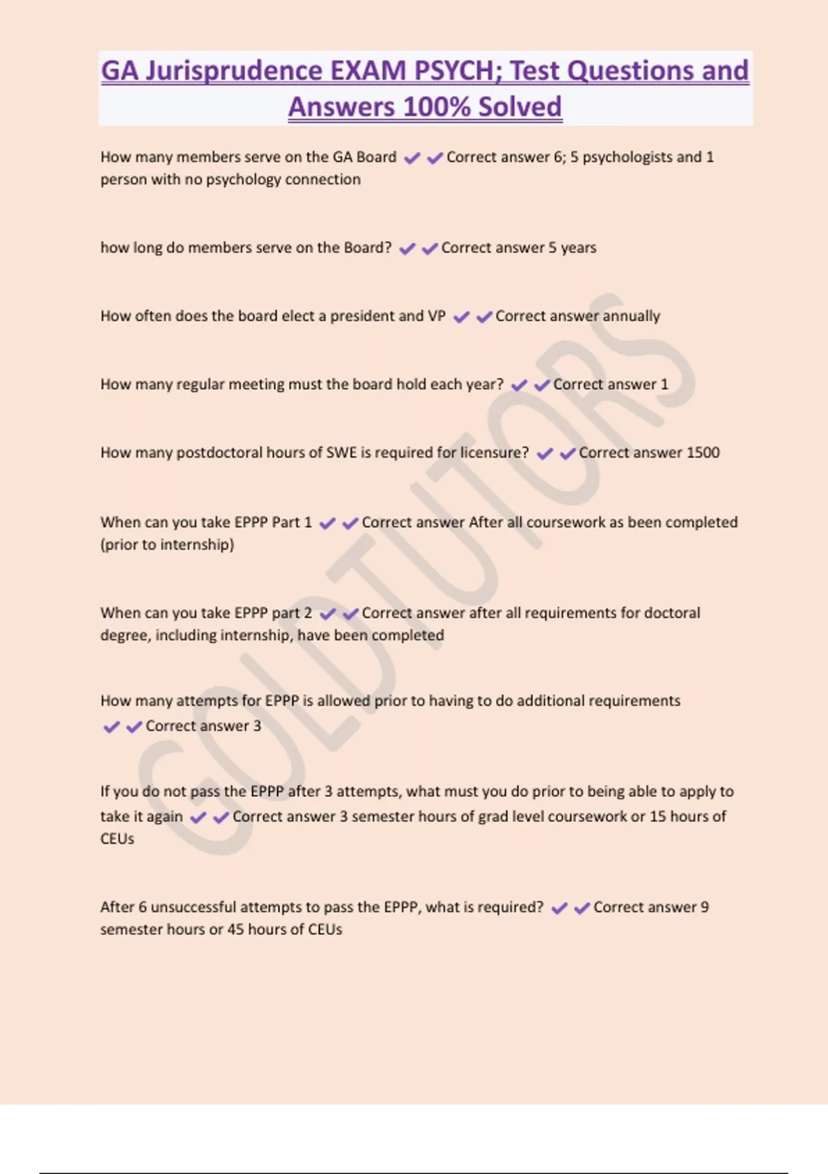 GA Jurisprudence EXAM PSYCH; Test Questions and Answers 100% Solved How many members serve on the GA Board Correct answer 6; 5 psychologists and 1 person with no psychology connection how long do members serve on the Board? Correct answer 5 years How often does the board elect a president and VP Correct answer annually How many regular meeting must the board hold each year? Correct answer 1 How many postdoctoral hours of SWE is required for licensure? Correct answer 1500 When can you take EPPP Part 1 Correct answer After all coursework as been completed (prior to internship)
