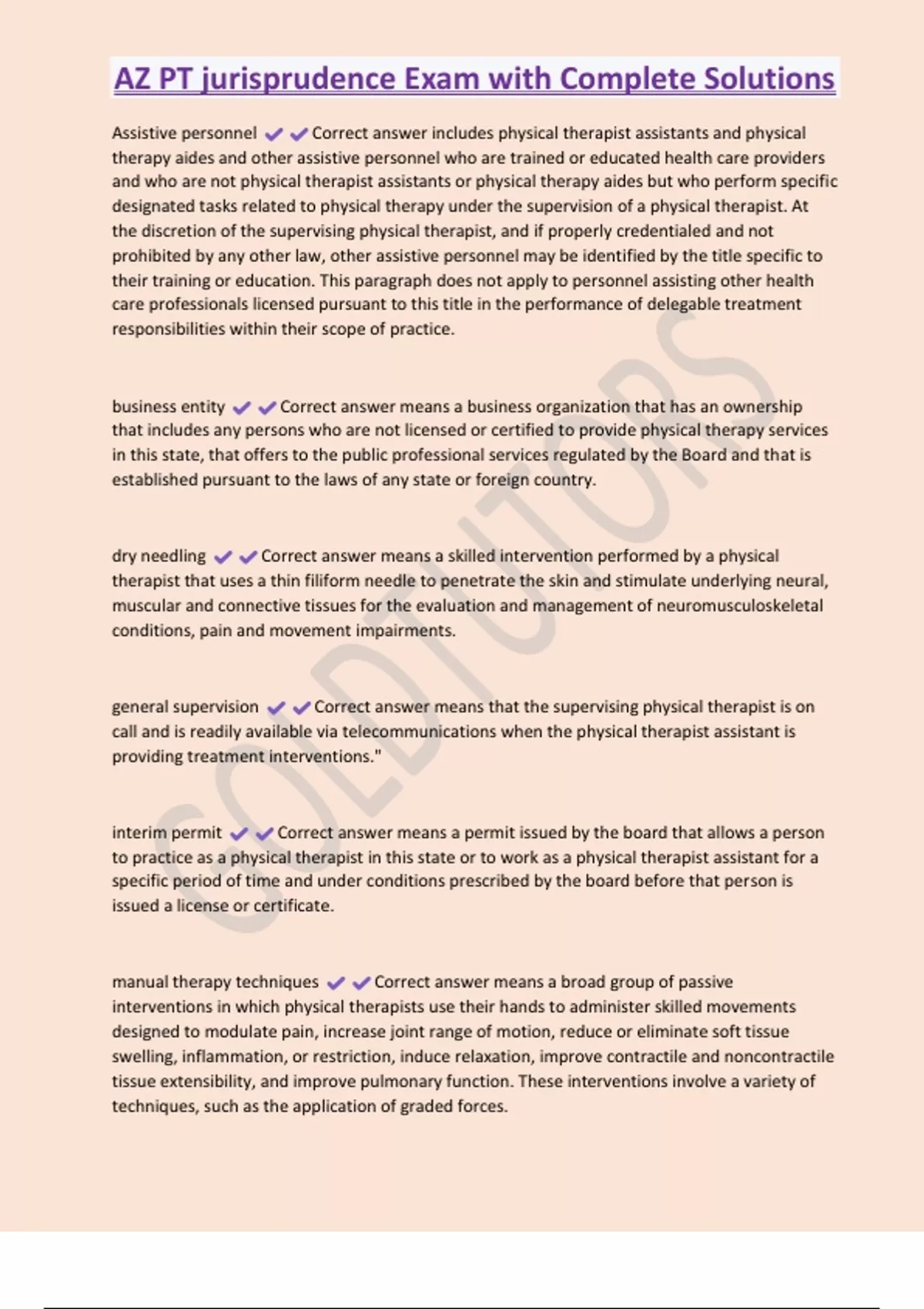 AZ PT jurisprudence Exam with Complete Solutions Assistive personnel Correct answer includes physical therapist assistants and physical therapy aides and other assistive personnel who are trained or educated health care providers and who are not physical therapist assistants or physical therapy aides but who perform specific designated tasks related to physical therapy under the supervision of a physical therapist. At the discretion of the supervising physical therapist, and if properly credentialed and not prohibited by any other law, other assistive personnel may be identified by the title specific to their training or education. This paragraph does not apply to personnel assisting other health care professionals licensed pursuant to this title in the performance of delegable treatment responsibilities within their scope of practice.