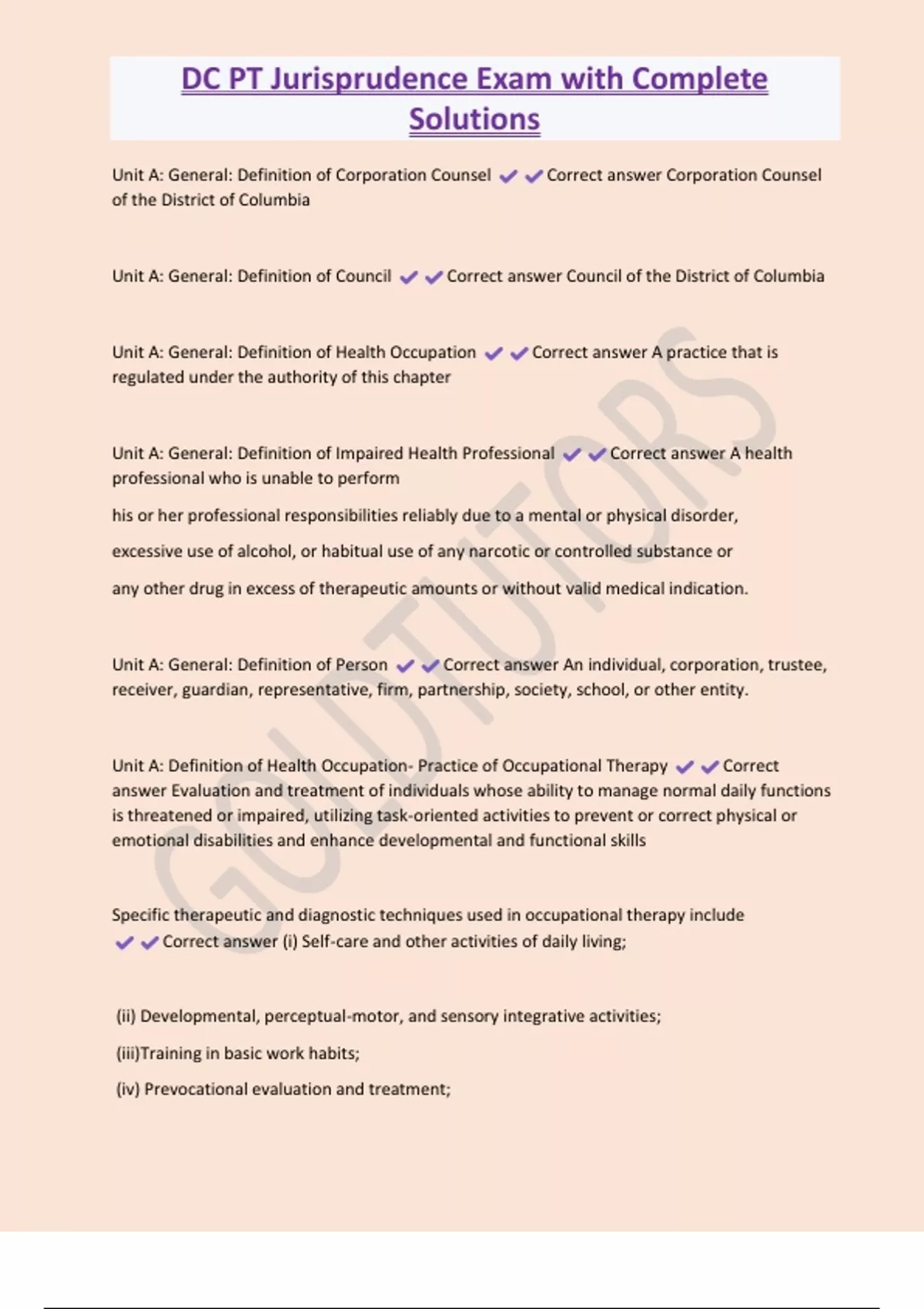 DC PT Jurisprudence Exam with Complete Solutions Unit A: General: Definition of Corporation Counsel Correct answer Corporation Counsel of the District of Columbia Unit A: General: Definition of Council Correct answer Council of the District of Columbia Unit A: General: Definition of Health Occupation Correct answer A practice that is regulated under the authority of this chapter Unit A: General: Definition of Impaired Health Professional Correct answer A health professional who is unable to perform