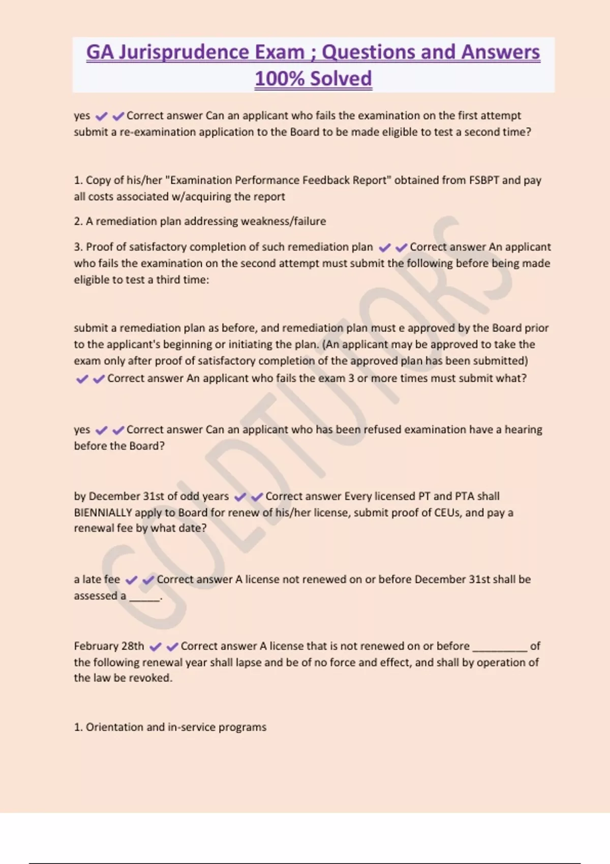 GA Jurisprudence Exam ; Questions and Answers 100% Solved yes Correct answer Can an applicant who fails the examination on the first attempt submit a re-examination application to the Board to be made eligible to test a second time? 1. Copy of his/her "Examination Performance Feedback Report" obtained from FSBPT and pay all costs associated w/acquiring the report 2. A remediation plan addressing weakness/failure 3. Proof of satisfactory completion of such remediation plan Correct answer An applicant who fails the examination on the second attempt must submit the following before being made eligible to test a third time: submit a remediation plan as before, and remediation plan must e approved by the Board prior to the applicant's beginning or initiating the plan. (An applicant may be approved to take the exam only after proof of satisfactory completion of the approved plan has been submitted) Correct answer An applicant who fails the exam 3 or more times must submit what?
