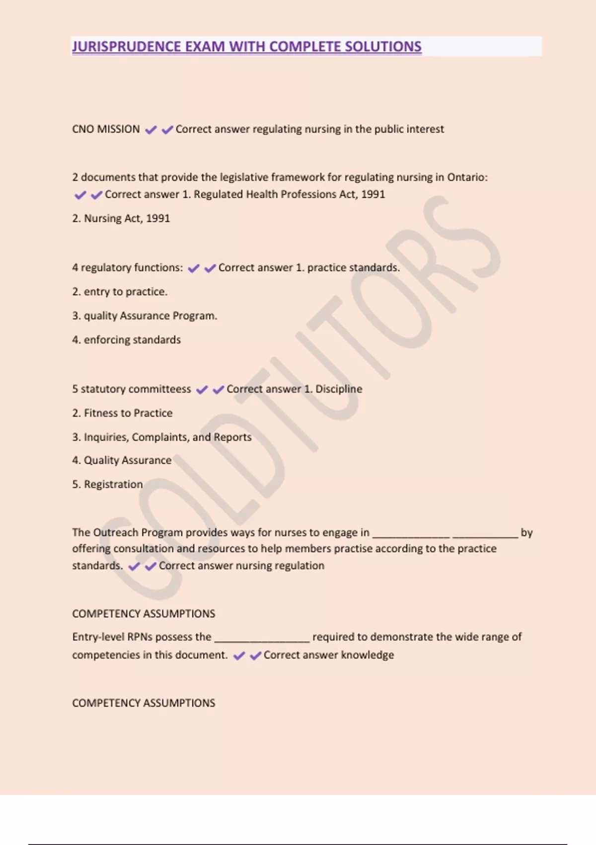JURISPRUDENCE EXAM WITH COMPLETE SOLUTIONS CNO MISSION Correct answer regulating nursing in the public interest 2 documents that provide the legislative framework for regulating nursing in Ontario: Correct answer 1. Regulated Health Professions Act, 1991 2. Nursing Act, 1991 4 regulatory functions: Correct answer 1. practice standards. 2. entry to practice. 3. quality Assurance Program. 4. enforcing standards