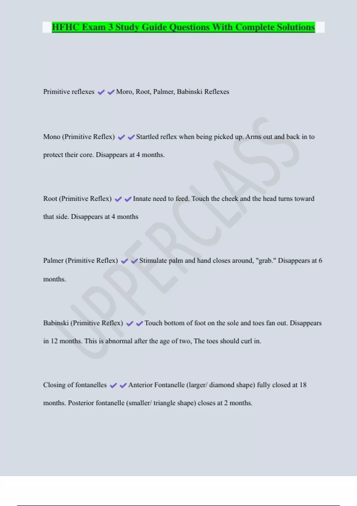 HFHC Exam 3 Study Guide Questions With Complete Solutions Primitive reflexes Moro, Root, Palmer, Babinski Reflexes Mono (Primitive Reflex) Startled reflex when being picked up. Arms out and back in to protect their core. Disappears at 4 months. Root (Primitive Reflex) Innate need to feed. Touch the cheek and the head turns toward that side. Disappears at 4 months Palmer (Primitive Reflex) Stimulate palm and hand closes around, "grab." Disappears at 6 months
