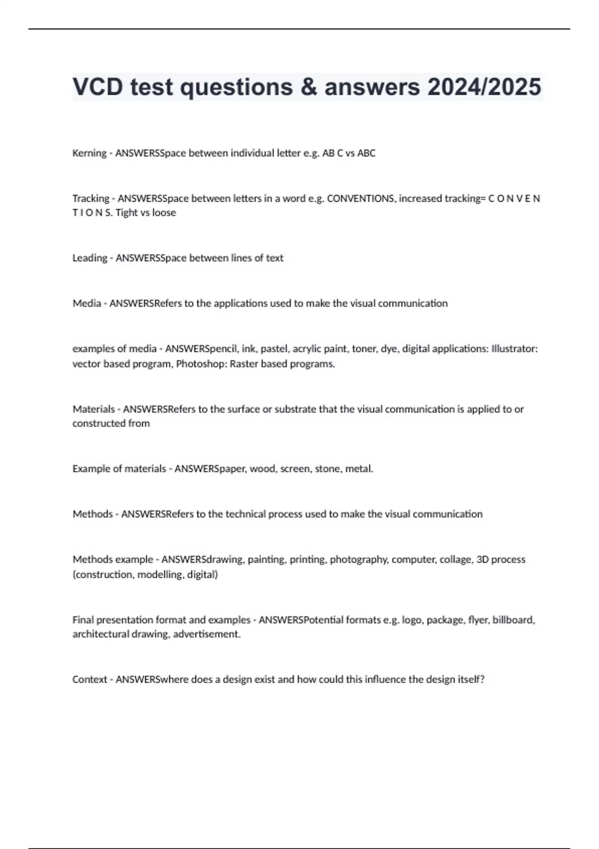 VCD test questions & answers 2024/2025 Kerning - ANSWERSSpace between individual letter e.g. AB C vs ABC Tracking - ANSWERSSpace between letters in a word e.g. CONVENTIONS, increased tracking= C O N V E N T I O N S. Tight vs loose Leading - ANSWERSSpace between lines of text Media - ANSWERSRefers to the applications used to make the visual communication examples of media - ANSWERSpencil, ink, pastel, acrylic paint, toner, dye, digital applications: Illustrator: vector based program, Photoshop: Raster based programs. Materials - ANSWERSRefers to the surface or substrate that the visual communication is applied to or constructed from Example of materials - ANSWERSpaper, wood, screen, stone, metal. Methods - ANSWERSRefers to the technical process used to make the visual communication Methods example - ANSWERSdrawing, painting, printing, photography, computer, collage, 3D process (construction, modelling, digital) Final presentation format and examples - ANSWERSPotential formats e.g. logo, package, flyer, billboard, architectural drawing, advertisement. Context - ANSWERSwhere does a design exist and how could this influence the design itself?