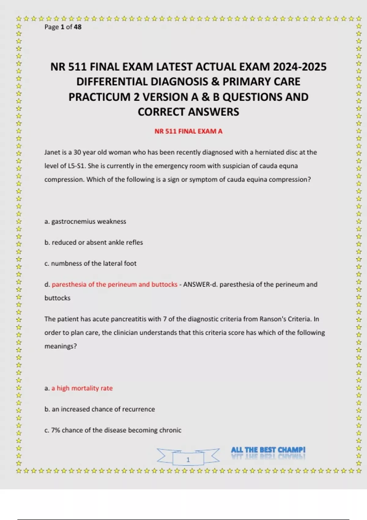 NR 511 FINAL EXAM LATEST ACTUAL EXAM DIFFERENTIAL DIAGNOSIS & PRIMARY CARE PRACTICUM 2 VERSION A & B QUESTIONS AND CORRECT ANSWERS