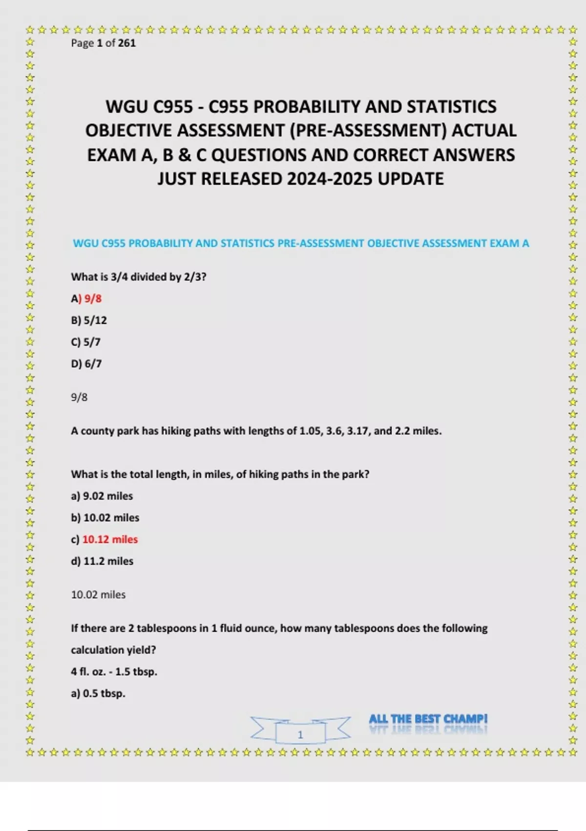 WGU C955 - C955 PROBABILITY AND STATISTICS OBJECTIVE ASSESSMENT (PRE-ASSESSMENT) ACTUAL EXAM A, B & C QUESTIONS AND CORRECT ANSWERS JUST RELEASED UPDATE