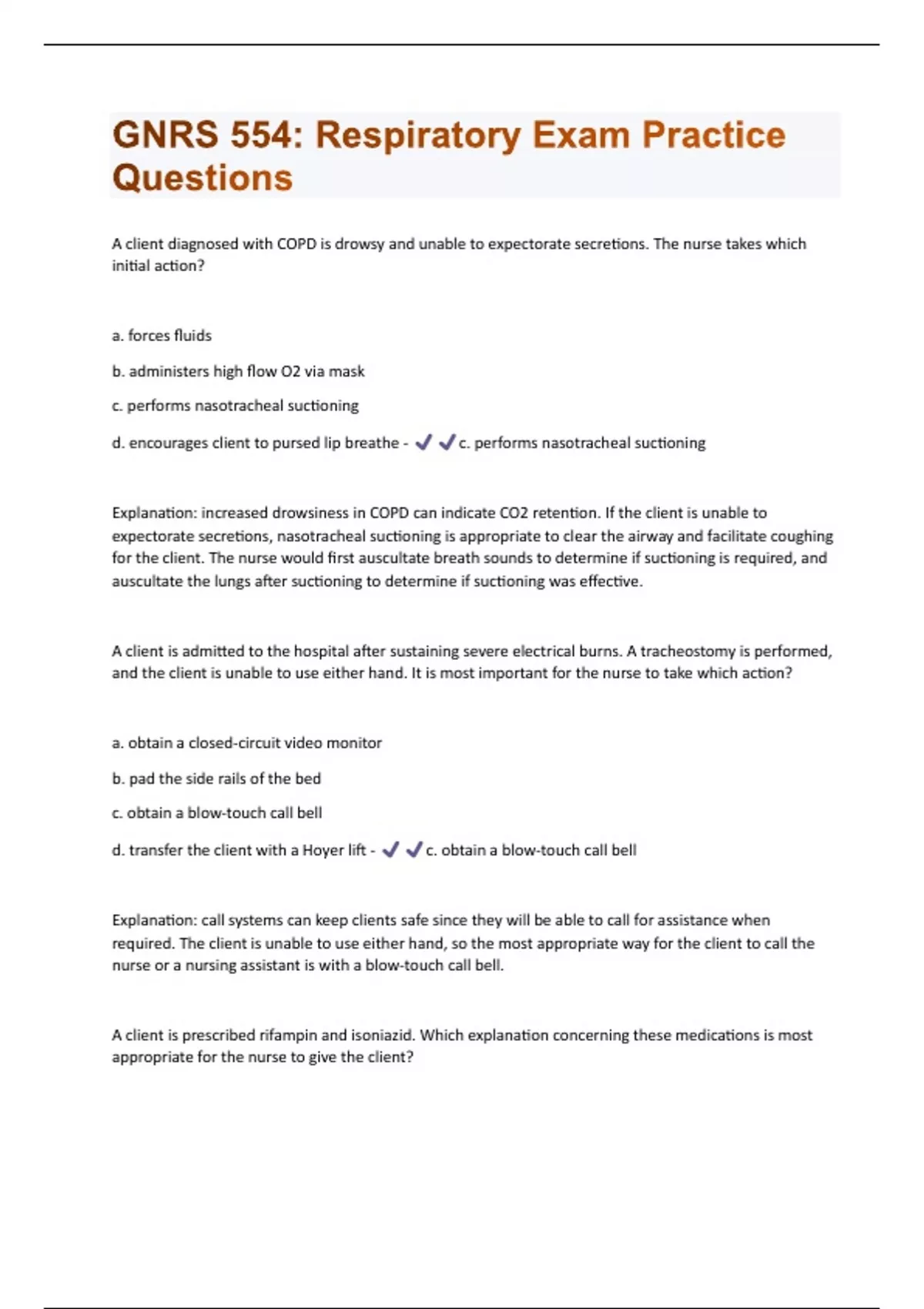 A client diagnosed with COPD is drowsy and unable to expectorate secretions. The nurse takes which initial action? a. forces fluids b. administers high flow O2 via mask c. performs nasotracheal suctioning d. encourages client to pursed lip breathe - c. performs nasotracheal suctioning Explanation: increased drowsiness in COPD can indicate CO2 retention. If the client is unable to expectorate secretions, nasotracheal suctioning is appropriate to clear the airway and facilitate coughing for the client. The nurse would first auscultate breath sounds to determine if suctioning is required, and auscultate the lungs after suctioning to determine if suctioning was effective. A client is admitted to the hospital after sustaining severe electrical burns. A tracheostomy is performed, and the client is unable to use either hand. It is most important for the nurse to take which action? a. obtain a closed-circuit video monitor b. pad the side rails of the bed c. obtain a blow-touch call bell d. transfer the client with a Hoyer lift - c. obtain a blow-touch call bell Explanation: call systems can keep clients safe since they will be able to call for assistance when required. The client is unable to use either hand, so the most appropriate way for the client to call the nurse or a nursing assistant is with a blow-touch call bell. A client is prescribed rifampin and isoniazid. Which explanation concerning these medications is most appropriate for the nurse to give the client?a. "you will have to take these medications for the rest of your life." b. "you must isolate yourself from your family while on these medications." c. "you will have to take these medications for 6-9 months." d. "you will need to take these medications only when you have symptoms." - c. "you will have to take these medications for 6-9 months." Explanation: It is important that people with TB get treated, take medications exactly as prescribed, and complete the medication regimen. Due to development of drug-resistant strains of TB, multiple medications are prescribed. If a client stops taking the medications too soon, the client can become sick again. If the client does not take the medications correctly, the TB bacteria that are still alive may become resistant to those medications. TB that is resistant to drugs is harder and more expensive to treat. A client is scheduled for rhinoplasty. Postoperatively, it is most important for the nurse to place the client in which position? a. supine b. left sims c. modified trendelenburg d. semi-fowler - d. semi-fowler Explanation: the client is positioned on the back with the head and trunk raised to between 15 and 45 degrees. The client should be placed in semi-fowler position to decrease edema, promote drainage, and facilitate breathing. A client requires emergency tracheostomy. When caring for the tracheostomy, the nurse takes which action? a. suctions the tracheostomy every hour b. cleans the inner cannula after suctioning c. cleans the site every four hours d. hyperextends the client's neck to maintain patency - c. cleans the site every four hours