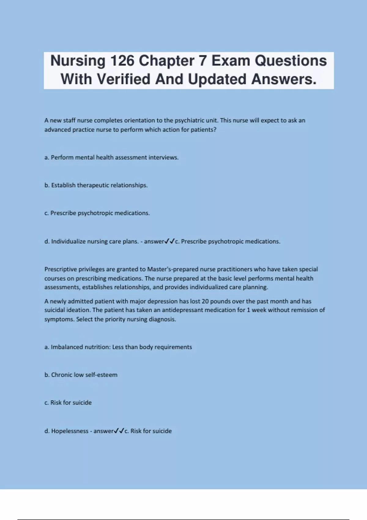 Nursing 126 Chapter 7 Exam Questions With Verified And Updated Answers. A new staff nurse completes orientation to the psychiatric unit. This nurse will expect to ask an advanced practice nurse to perform which action for patients? a. Perform mental health assessment interviews. b. Establish therapeutic relationships. c. Prescribe psychotropic medications. d. Individualize nursing care plans. - answerc. Prescribe psychotropic medications. Prescriptive privileges are granted to Master's-prepared nurse practitioners who have taken special courses on prescribing medications. The nurse prepared at the basic level performs mental health assessments, establishes relationships, and provides individualized care planning. A newly admitted patient with major depression has lost 20 pounds over the past month and has suicidal ideation. The patient has taken an antidepressant medication for 1 week without remission of symptoms. Select the priority nursing diagnosis. a. Imbalanced nutrition: Less than body requirements b. Chronic low self-esteem c. Risk for suicide d. Hopelessness - answerc. Risk for suicide Risk for suicide is the priority diagnosis when the patient has both suicidal ideation and a plan to carry out the suicidal intent. Imbalanced nutrition, Hopelessness, and Chronic low self-esteem may be applicable nursing diagnoses, but these problems do not affect patient safety as urgently as a suicide attempt. A patient with major depression has lost 20 pounds in one month has chronic low self-esteem and a plan for suicide. The patient has taken an antidepressant medication for 1 week. Which nursing intervention is most directly related to this outcome: "Patient will refrain from gestures and attempts to harm self"? a. Implement suicide precautions. b. Frequently offer high-calorie snacks and fluids. c. Assist the patient to identify three personal strengths. d. Observe patient for therapeutic effects of antidepressant medication. - answera. Implement suicide precautions. Implementing suicide precautions is the only option related to patient safety. The other options, related to nutrition, self-esteem, and medication therapy, are important but are not priorities. A patient's nursing diagnosis is Insomnia. The desired outcome is: "Patient will sleep for a minimum of 5 hours nightly by October 31." On November 1, a review of the sleep data shows the patient sleeps an average of 4 hours nightly and takes a 2-hour afternoon nap. Which evaluation should be documented? a. Consistently demonstrated b. Often demonstrated c. Sometimes demonstrated d. Never demonstrated - answerd. Never demonstrated Although the patient is sleeping 6 hours daily, the total is not in one uninterrupted session at night. Therefore the outcome must be evaluated as never demonstrated. A patient's nursing diagnosis is Insomnia. The desired outcome is: "Patient will sleep for a minimum of 5 hours nightly by October 31." On November 1, a review of the sleep data shows the patient sleeps an average of 4 hours nightly and takes a 2-hour afternoon nap. What is the nurse's next action? a. Continue the current plan without changes. b. Remove this nursing diagnosis from the plan of care. c. Write a new nursing diagnosis that better reflects the problem. d. Revise the target date for outcome attainment and examine interventions. - answerd. Revise the target date for outcome attainment and examine interventions. Sleeping a total of 5 hours at night remains a reasonable outcome. Extending the time frame for attaining the outcome is appropriate. Examining interventions might result in planning an activity during the afternoon rather than permitting a nap. Continuing the current plan without changes is inappropriate. At the very least, the time in which the outcome is to be attained must be extended. Removing this nursing diagnosis from the plan of care could be used when the outcome goal has been met and the problem resolved. Writing a new nursing diagnosis is inappropriate because no other nursing diagnosis relates to the problem. A patient begins a new program to assist with building social skills. In which part of the plan of care should a nurse record the item "Encourage patient to attend one psychoeducational group daily"? a. Assessment b. Analysis c. Planning d. Implementation e. Evaluation - answerd. Implementation Interventions are the nursing prescriptions to ach