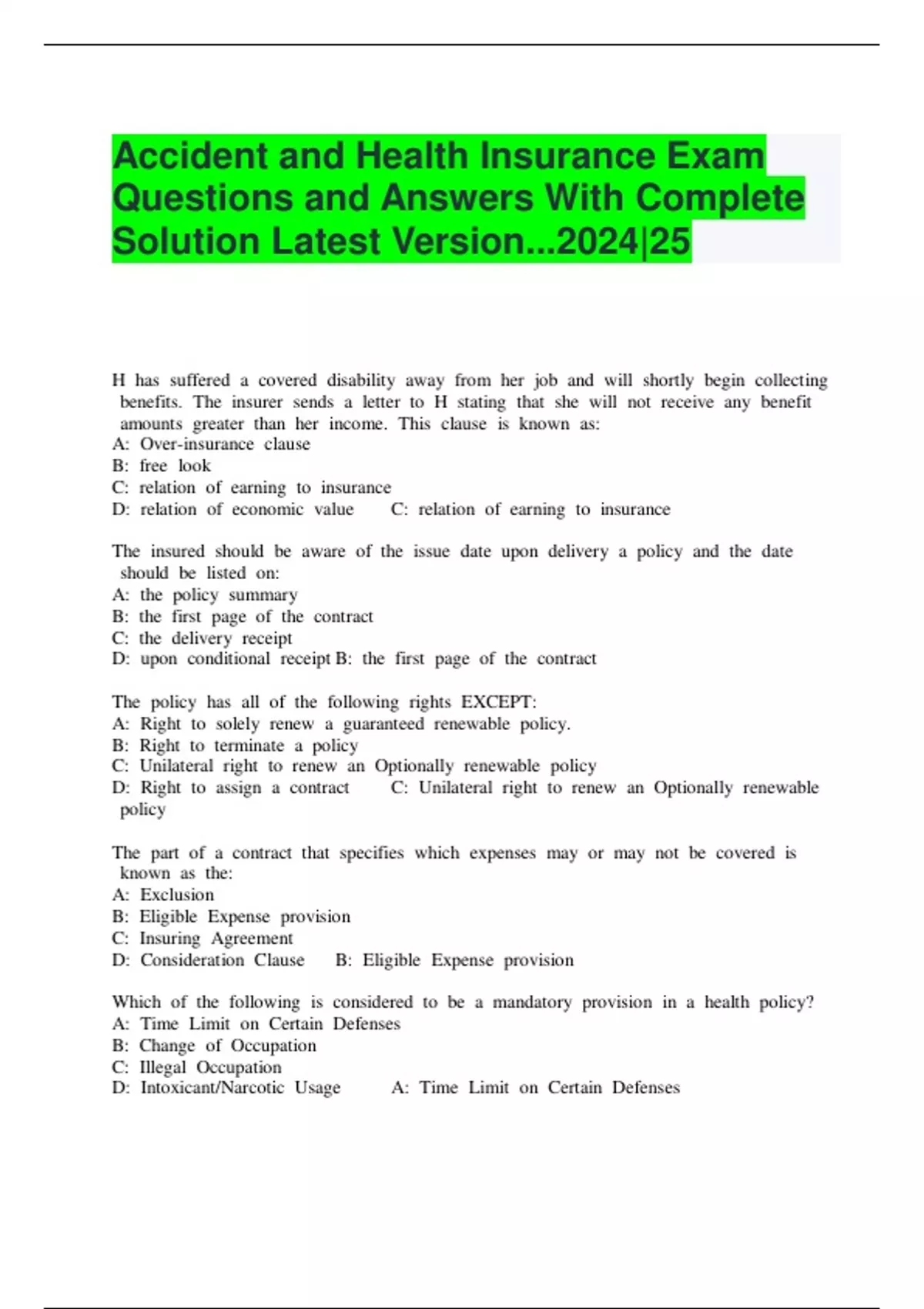 Accident and Health Insurance Exam Questions and Answers With Complete Solution Latest Version...2024|25