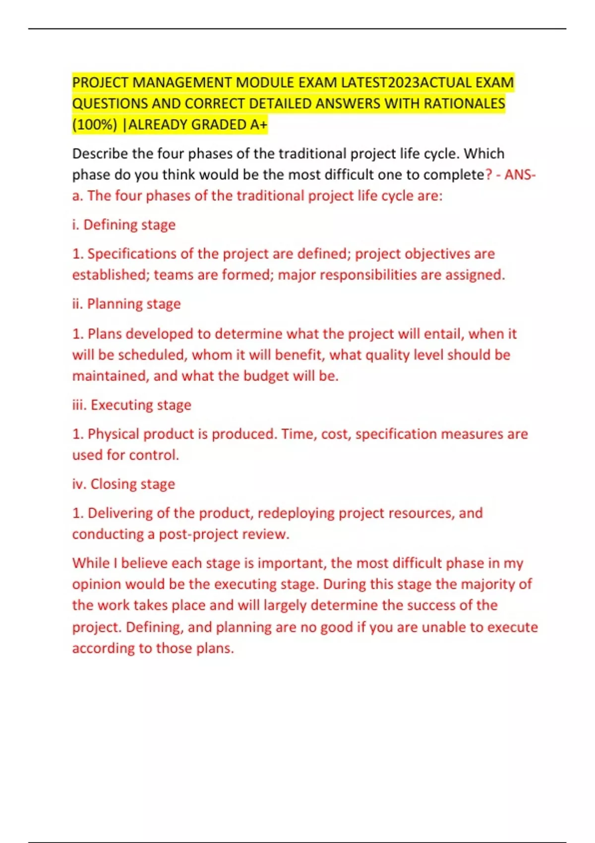 PROJECT MANAGEMENT MODULE EXAM LATEST2023ACTUAL EXAM QUESTIONS AND CORRECT DETAILED ANSWERS WITH RATIONALES (100%) |ALREADY GRADED A+