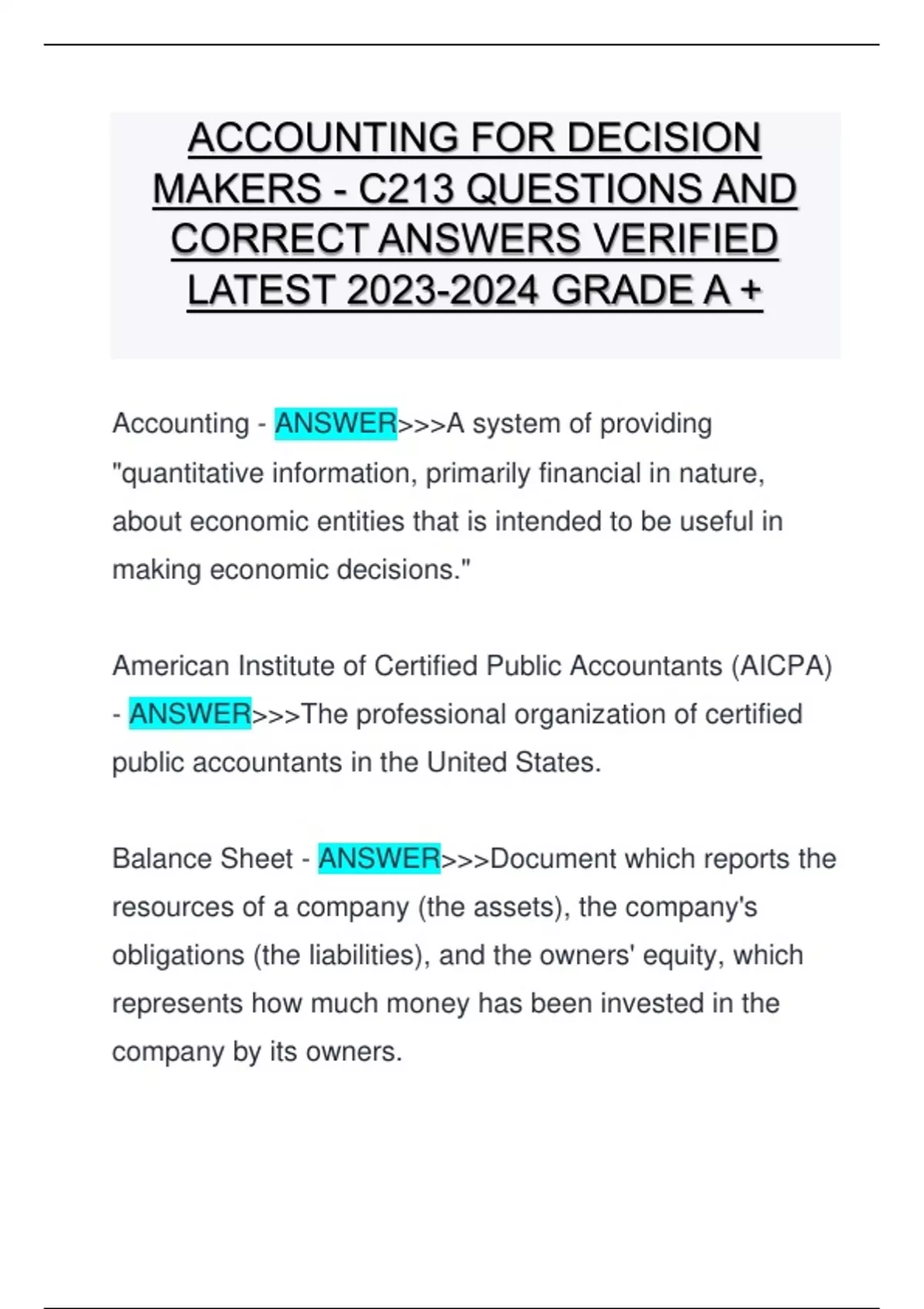 ACCOUNTING FOR DECISION MAKERS - C213 QUESTIONS AND CORRECT ANSWERS VERIFIED LATEST GRADE A + ACCOUNTING FOR DECISION MAKERS - C213 QUESTIONS AND CORRECT ANSWERS VERIFIED LATEST GRADE A + ACCOUNTING FOR DECISION MAKERS - C213 QUESTIONS AND CORRECT ANSWERS VERIFIED LATEST GRADE A +