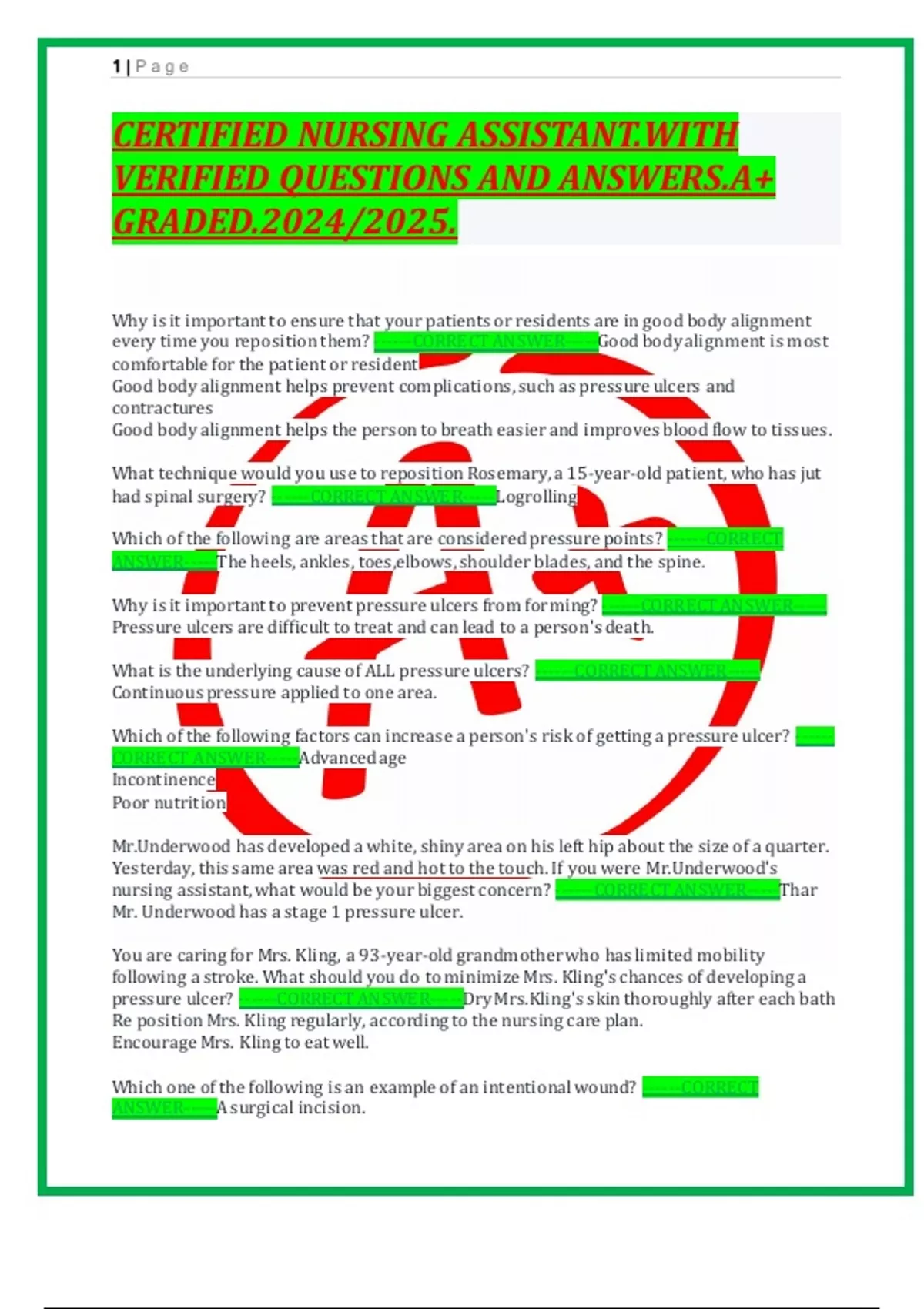 CERTIFIED NURSING ASSISTANT.WITH VERIFIED QUESTIONS AND ANSWERS.A+ GRADED.2024/2025.