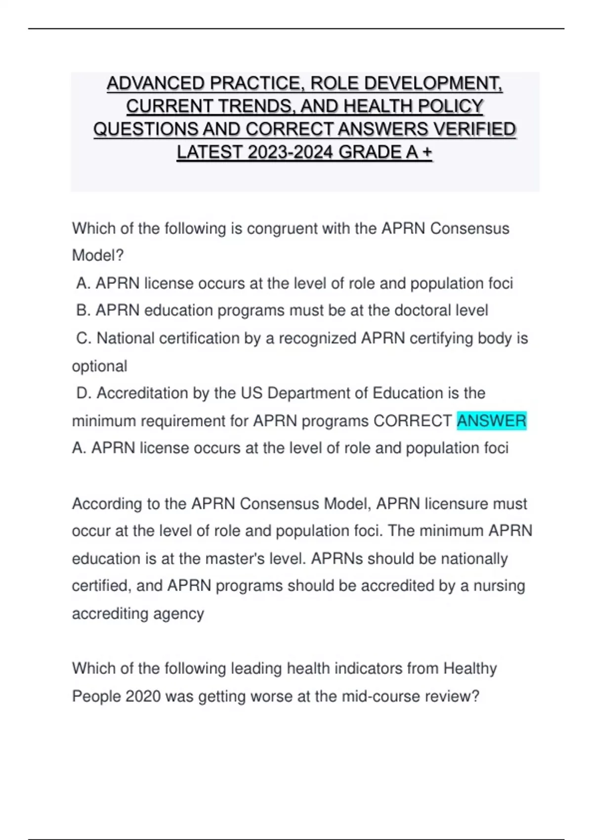 ADVANCED PRACTICE, ROLE DEVELOPMENT, CURRENT TRENDS, AND HEALTH POLICY QUESTIONS AND CORRECT ANSWERS VERIFIED LATEST GRADE A +
