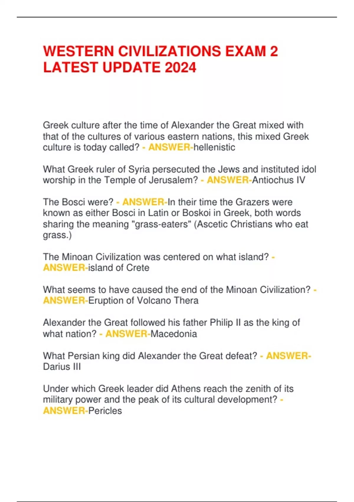 WESTERN CIVILIZATIONS EXAM 2 LATEST UPDATE 2024 Greek culture after the time of Alexander the Great mixed with that of the cultures of various eastern nations, this mixed Greek culture is today called? - ANSWER-hellenistic What Greek ruler of Syria persecuted the Jews and instituted idol worship in the Temple of Jerusalem? - ANSWER-Antiochus IV The Bosci were? - ANSWER-In their time the Grazers were known as either Bosci in Latin or Boskoi in Greek, both words sharing the meaning "grass-eaters" (Ascetic Christians who eat grass.) The Minoan Civilization was centered on what island? - ANSWER-island of Crete What seems to have caused the end of the Minoan Civilization? - ANSWER-Eruption of Volcano Thera Alexander the Great followed his father Philip II as the king of what nation? - ANSWER-Macedonia What Persian king did Alexander the Great defeat? - ANSWERDarius III Under which Greek leader did Athens reach the zenith of its military power and the peak of its cultural development? - ANSWER-Pericles What happened at the Battle of Salmis in 479 BC that was so important for the future of Greece? - ANSWER-Greek navy defeated the Persians. In which battle did the famous 300 Spartans fights? - ANSWERBattle of Thermopylae Which man was responsible for killing Alexander the Great's family? - ANSWER-Casandor The members of the First Triumvirate were? - ANSWER-Julius Caesar, Crassus, and Pompei Which was not a provision of the Benedictine Rule? - ANSWERMarriage Who was the first true "emperor" of the Roman Empire? - ANSWER-Caesar Augustus What famous general led the Carthagenians and almost defeated Rome in the 2nd Punic War? - ANSWER-Hannibal the Great Ancient, heavily-armed, Greek, Infantry soldiers were called? - ANSWER-Hoplites Which two cities fought each other in the Peloponnesian Wars? - ANSWER-An ancient Greek war fought by Athens and its empire against the Peloponnesian League led by Sparta. The monastery of Monte Cassino in Italy was founded by? - ANSWER-St. Benedict Pachomius was the founder of? - ANSWER-Cenobitic Monasticism Which was not one of the four great Greek families which divided the Empire of Alexander the Great into four kingdoms? - ANSWER-Attalios, Ptolemies, Seleucids, Antigonids The lower class people of ancient Greece were called? - ANSWER-Demoi The upper class people of ancient Greece were called? - ANSWER-Aristo A trireme was? - ANSWER-A Greek warship Which Jewish group was violently opposed to Roman rule? - ANSWER-Zelots The "Pax Romana" was? - ANSWER-This was the long period of relative peace and minimal expansion by military force experienced by the Roman Empire in the 1st and 2nd centuries AD Which Roman emperor went totally insane? - ANSWER-Nero