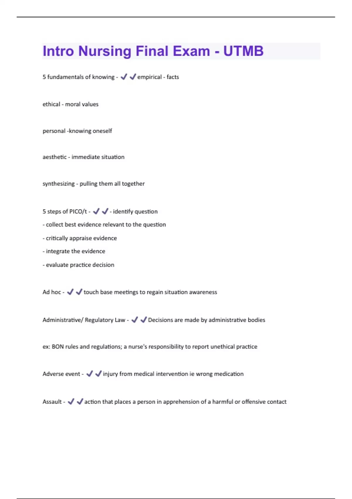 5 fundamentals of knowing - empirical - facts ethical - moral values personal -knowing oneself aesthetic - immediate situation synthesizing - pulling them all together 5 steps of PICO/t - - identify question - collect best evidence relevant to the question - critically appraise evidence - integrate the evidence - evaluate practice decision Ad hoc - touch base meetings to regain situation awareness Administrative/ Regulatory Law - Decisions are made by administrative bodies ex: BON rules and regulations; a nurse's responsibility to report unethical practice Adverse event - injury from medical intervention ie wrong medication Assault - action that places a person in apprehension of a harmful or offensive contactie: performing surgery without signed consent Autonomy - having the right to make your own decision Battery - intentional touching w/o consent ie: threatening to give injection and actually doing it Beneficence - doing good BON - protects public from unsafe nursing practice -provides approval for nursing education programs - issues licenses - provides nursing practice and education guidance to current nurses - subject to TX Sunset Act Burnout - Results form excessive & prolonged stress - feelings of senselessness or hopelessness - feelings of failure - loss of a sense of personal identity Call Out - Used to communicate critical information ie Airway status?airway clear breath sounds breath sounds decreased on right Case/ Common Law - Decisions made in court - informed consent - patients right to refuse treatment - negligence - malpractice Check back - used to validate and verify information exchanged ie; medication repeat Civil laws - - protects the right of individuals - provides fair and equal treatment - damages lead to fines or public service Ex: Nurse is negligent Clara Barton - - American red cross and army nurse corps - passed the geneva convention Criminal Laws - - protect society as a whole - felony - crime that has penalty of imprisonment for more than 1 yr or death - misdemeanor - less serious crime with a fine or imprisonment less than 1 yr Ex: nurse is misusing controlled substancesCross monitoring - Strategy to reduce errors - watching each others back CUS method - Concerned Uncomfortable Safety Issue allows team members to clearly understand the issue and the magnitude DESC script - describe express suggest consequences - used to communicate during conflict and very effective in personal conflict Dorthea Orem - Match client with appropriate intervention based on self care needs Ethics - the study of moral principles of our interaction with other people Experimental - Eliminates bias and controls variables so that afterwards the researchers knows if the intervention leads to better outcomes - has a control & treatment group ex; drug tests or medical treatmentsExternal variables - - family practices - socioeconomic factors - cultural backgrounds Fiedlity - honoring ones commitment "ill be right back" Handoff - Transfer of info and authority/responsibility during transitions in care - ie shift change Harm scores - The higher the number the worse the outcome Health belief model - Addresses the relationship between a person's beliefs and behaviors - internal & external variables - can positively or negatively influence health behaviors Healthy people 2020 - A vision that society is a place where all people live long healthy lives. Prevent health problems before they arise. - obesity rates are increasing - which often leads to a lower social well being Hospital acquired complications - - falls - decubiti - performing wrong surgery - air embolism - CAUTI - foreign object retained after surgeryI PASS the BATON - Introduce - name and job Patient - name, sex,age Assessment - chief complaint Situation - current status Safety concerns - lab values The Background - family hx,meds Actions - most important info Timing - level of urgency Ownership - why is resp. Next - anticipated changes