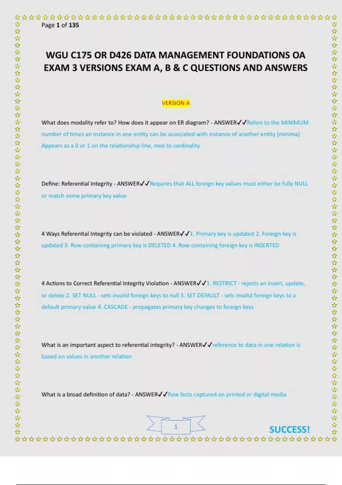 WGU C175 OR D426 DATA MANAGEMENT FOUNDATIONS OA EXAM 3 VERSIONS EXAM A, B & C QUESTIONS AND ANSWERS
