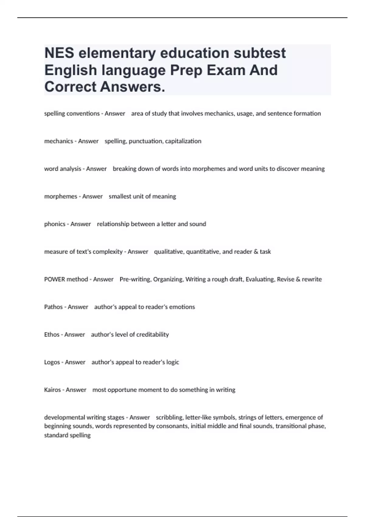 NES elementary education subtest English language Prep Exam And Correct Answers.