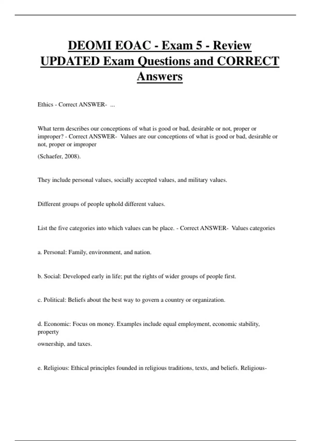 DEOMI EOAC - Exam 5 - Review UPDATED Exam Questions and CORRECT Answers Ethics - Correct ANSWER- ... What term describes our conceptions of what is good or bad, desirable or not, proper or improper? - Correct ANSWER- Values are our conceptions of what is good or bad, desirable or not, proper or improper (Schaefer, 2008). They include personal values, socially accepted values, and military values. Different groups of people uphold different values