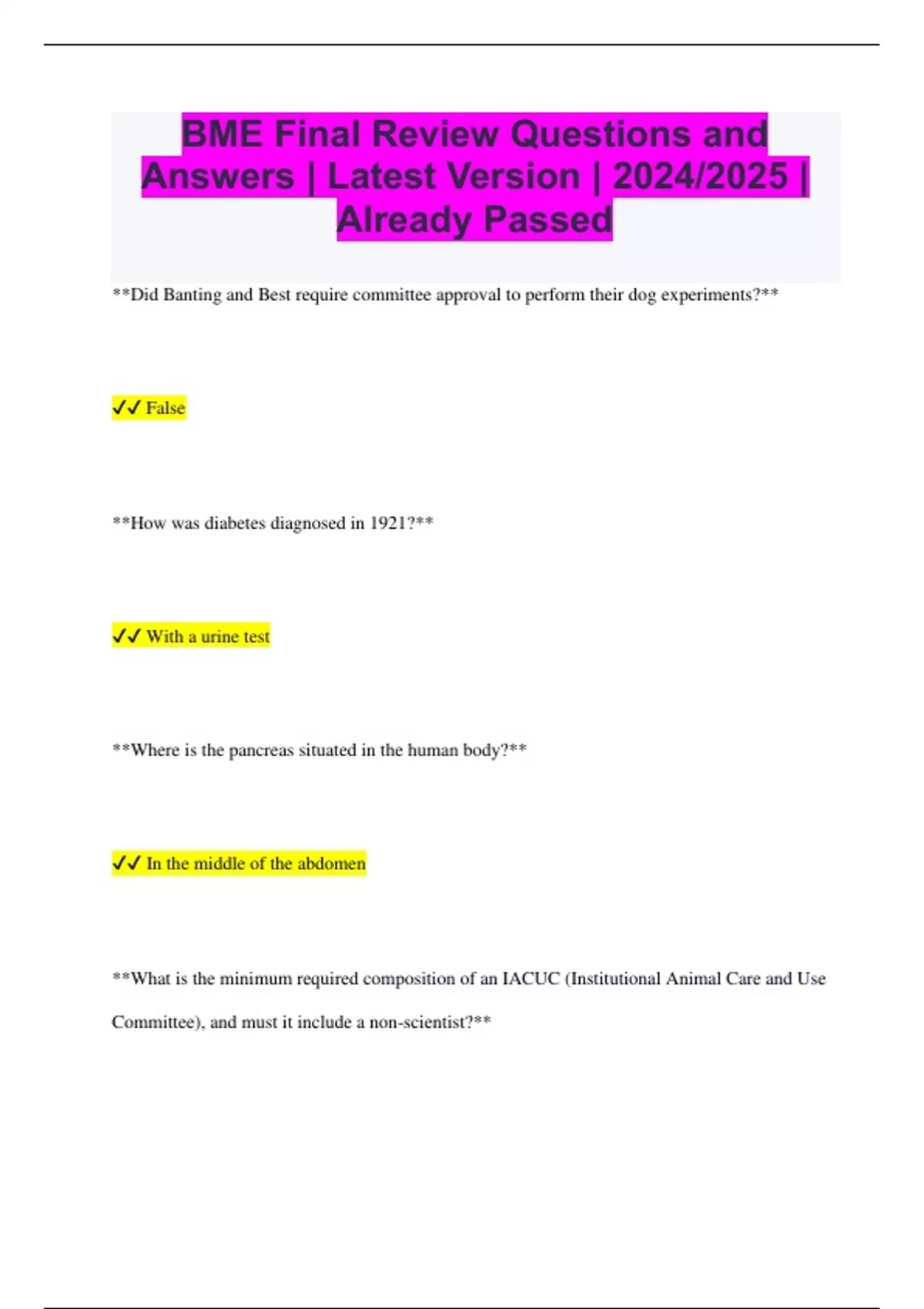 BME Final Review Questions and Answers | Latest Version | 2024/2025 | Already Passed **Did Banting and Best require committee approval to perform their dog experiments?** False **How was diabetes diagnosed in 1921?** With a urine test **Where is the pancreas situated in the human body?** In the middle of the abdomen **What is the minimum required composition of an IACUC (Institutional Animal Care and Use Committee), and must it include a non-scientist?** True **How was diabetes first documented in history?** Independently by many different cultures **Where did Fred Banting conduct his dog experiments?** At the University of Toronto **When did Fred Banting conceive his idea for treating diabetes?** While preparing a lecture for medical students **Are blood tests only used to count red blood cells?** False **Was blood glucose measurable by electronic meters around 1920?** False **What was the leading diabetes treatment around 1915?** The starvation diet **How did James Collip at the University of Toronto isolate insulin?** By using the solubility of insulin in alcohol/water mixtures **What was Banting's technique for isolating insulin involving pancreatic ducts?** This method was used to produce insulin just a few times **What is the term for the condition James Collip observed when injecting too much insulin into rabbits?** Hypoglycemia