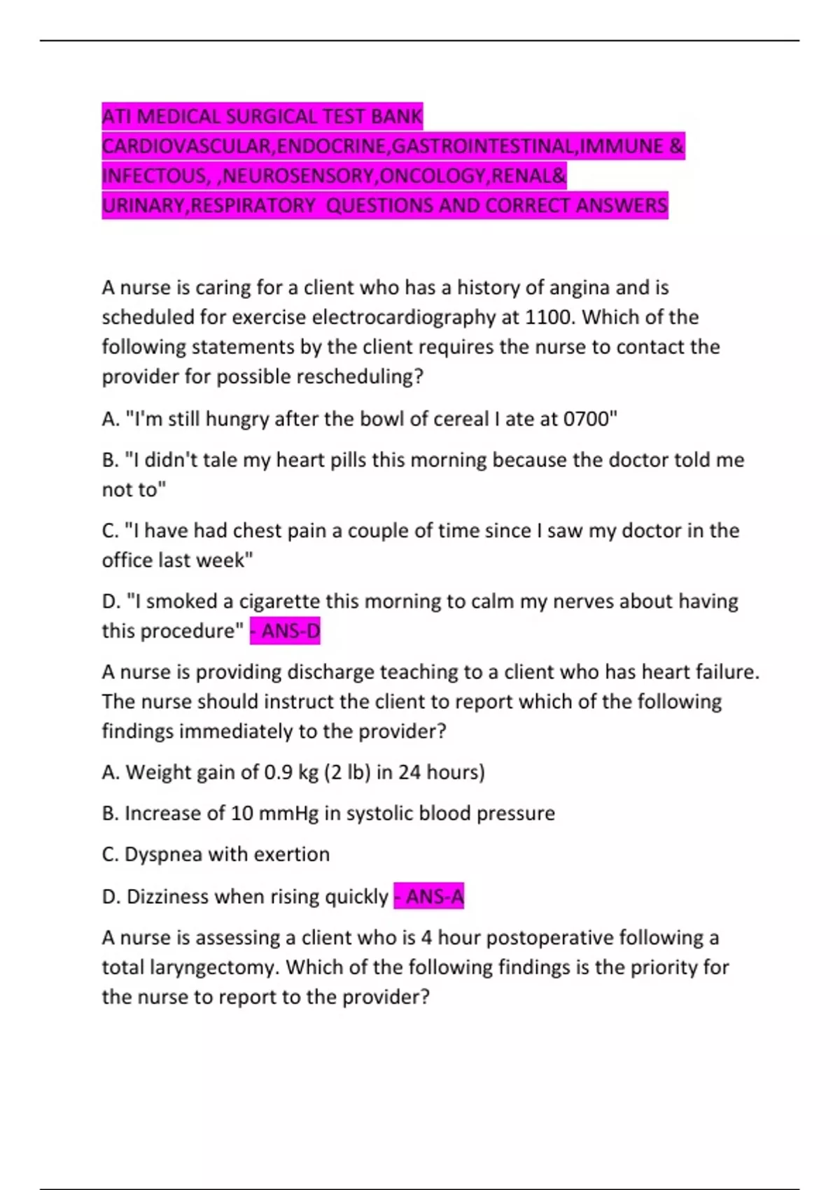 ATI MEDICAL SURGICAL TEST BANK CARDIOVASCULAR,ENDOCRINE,GASTROINTESTINAL,IMMUNE & INFECTOUS, ,NEUROSENSORY,ONCOLOGY,RENAL& URINARY,RESPIRATORY QUESTIONS AND CORRECT ANSWERS
