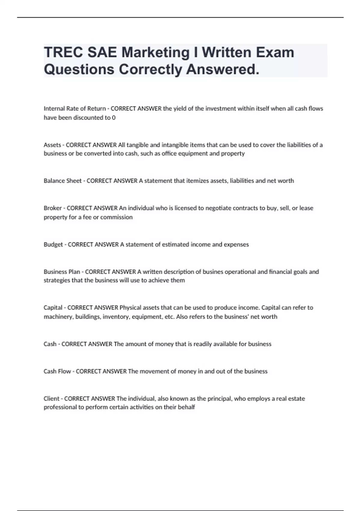 TREC SAE Marketing I Written Exam Questions Correctly Answered. Internal Rate of Return - CORRECT ANSWER the yield of the investment within itself when all cash flows have been discounted to 0 Assets - CORRECT ANSWER All tangible and intangible items that can be used to cover the liabilities of a business or be converted into cash, such as office equipment and property Balance Sheet - CORRECT ANSWER A statement that itemizes assets, liabilities and net worth Broker - CORRECT ANSWER An individual who is licensed to negotiate contracts to buy, sell, or lease property for a fee or commission Budget - CORRECT ANSWER A statement of estimated income and expenses Business Plan - CORRECT ANSWER A written description of busines operational and financial goals and strategies that the business will use to achieve them Capital - CORRECT ANSWER Physical assets that can be used to produce income. Capital can refer to machinery, buildings, inventory, equipment, etc. Also refers to the business' net worth Cash - CORRECT ANSWER The amount of money that is readily available for business Cash Flow - CORRECT ANSWER The movement of money in and out of the business Client - CORRECT ANSWER The individual, also known as the principal, who employs a real estate professional to perform certain activities on their behalf Customer - CORRECT ANSWER An individual who obtains the services of a real estate professional without a contract or binding agreement Debt Financing - CORRECT ANSWER Obtaining funding (loans) from lenders These loans incur interest and must be repaid within a specified period of time Equity - CORRECT ANSWER The difference between the value of an asset and the amount of money owed on the asset Equity Financing - CORRECT ANSWER In order to obtain funding, a company will sell a portion of ownership interest in the company in exchange for capital or funding Executive Summary - CORRECT ANSWER A written description that provides the reader with an overview of the business plan Fair Housing Act - CORRECT ANSWER Prohibits discrimination on the basis of race, color, religion, sex, hanicap, familiar status or national origin Farming - CORRECT ANSWER The process of branding a company or individual's name to a certain area, group of people, or segment of the market Inflation - CORRECT ANSWER An increase in the price level of goods ans services that cause a decrease in th epurchasing power of the buyer Liability - CORRECT ANSWER A company's or individual's legal obligation to take responsibility for any actions to pay Manager - CORRECT ANSWER The individual that organizes and oversees the company's financial and human resources Marketing - CORRECT ANSWER The process of promoting a company's products and services, including advertising and farming