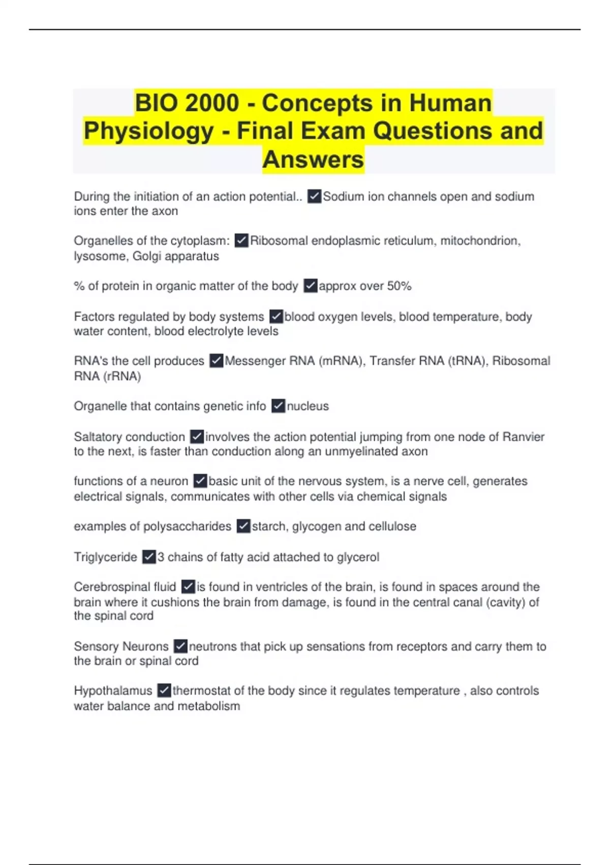 During the initiation of an action potential.. Sodium ion channels open and sodium ions enter the axon Organelles of the cytoplasm: Ribosomal endoplasmic reticulum, mitochondrion, lysosome, Golgi apparatus % of protein in organic matter of the body approx over 50% Factors regulated by body systems blood oxygen levels, blood temperature, body water content, blood electrolyte levels RNA's the cell produces Messenger RNA (mRNA), Transfer RNA (tRNA), Ribosomal RNA (rRNA) Organelle that contains genetic info nucleus Saltatory conduction involves the action potential jumping from one node of Ranvier to the next, is faster than conduction along an unmyelinated axon functions of a neuron basic unit of the nervous system, is a nerve cell, generates electrical signals, communicates with other cells via chemical signals examples of polysaccharides starch, glycogen and cellulose Triglyceride 3 chains of fatty acid attached to glycerol Cerebrospinal fluid is found in ventricles of the brain, is found in spaces around the brain where it cushions the brain from damage, is found in the central canal (cavity) of the spinal cord Sensory Neurons neutrons that pick up sensations from receptors and carry them to the brain or spinal cord Hypothalamus thermostat of the body since it regulates temperature , also controls water balance and metabolism
