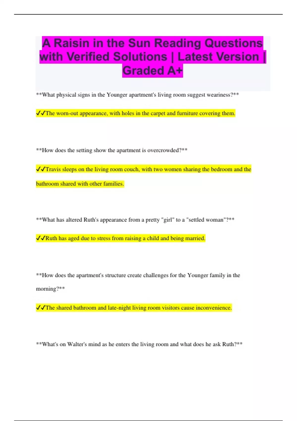 A Raisin in the Sun Reading Questions with Verified Solutions | Latest Version | Graded A+ **What physical signs in the Younger apartment's living room suggest weariness?** The worn-out appearance, with holes in the carpet and furniture covering them. **How does the setting show the apartment is overcrowded?** Travis sleeps on the living room couch, with two women sharing the bedroom and the bathroom shared with other families. **What has altered Ruth's appearance from a pretty "girl" to a "settled woman"?** Ruth has aged due to stress from raising a child and being married. **How does the apartment's structure create challenges for the Younger family in the morning?** The shared bathroom and late-night living room visitors cause inconvenience. **What's on Walter's mind as he enters the living room and what does he ask Ruth?** He's anxious about the arrival of the check today. **When is the check expected to arrive?** Saturday. **What do Walter's comments about Ruth looking young and calling her "baby" reveal about their relationship?** Their relationship lacks intimacy and communication. **What does Travis ask when he exits the bathroom?** He wants to know if the check will come tomorrow. **How do Walter and Ruth differ in their responses when Travis requests money for school, and what does this reveal about their financial attitudes?** Walter gives him 50 cents more, showing a more relaxed approach than Ruth, who is cautious. **Why does Ruth avoid hearing Walter's thoughts, and what has he been thinking about?** She's tired of hearing about his liquor store dreams. **According to Walter, how should women treat their men?** He believes they should support their ambitions. **How does Ruth respond to Walter's need for support?** She brushes him off, telling him to eat his eggs and get on with the day. **What are Beneatha's aspirations for the future, and why is Walter concerned about her plans?** She wants to become a doctor, causing financial worries for Walter. **What sacrifices does Walter believe the family has made for Beneatha, how does she react, and how does their conversation conclude?** He feels they've sacrificed everything for her education. She responds sarcastically, asserting her equal claim to their father's legacy. **How is Mama described in the stage directions?** Mama is portrayed as a strong woman in her sixties with white hair. **What does Mama retrieve when she opens the window, and what's unique about it?** She retrieves a small plant, symbolizing her nurturing nature. **How does Mama intervene in Ruth's life?** She offers advice and tells Ruth