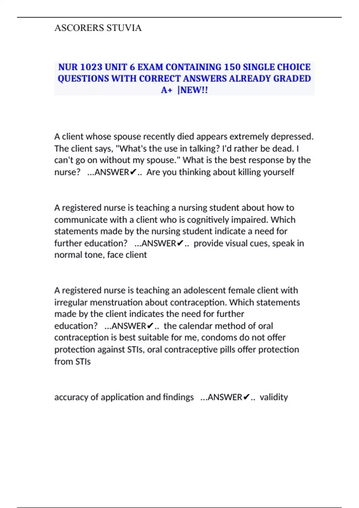 NUR 1023 UNIT 6 EXAM CONTAINING 150 SINGLE CHOICE QUESTIONS WITH CORRECT ANSWERS ALREADY GRADED A+ |NEW!!