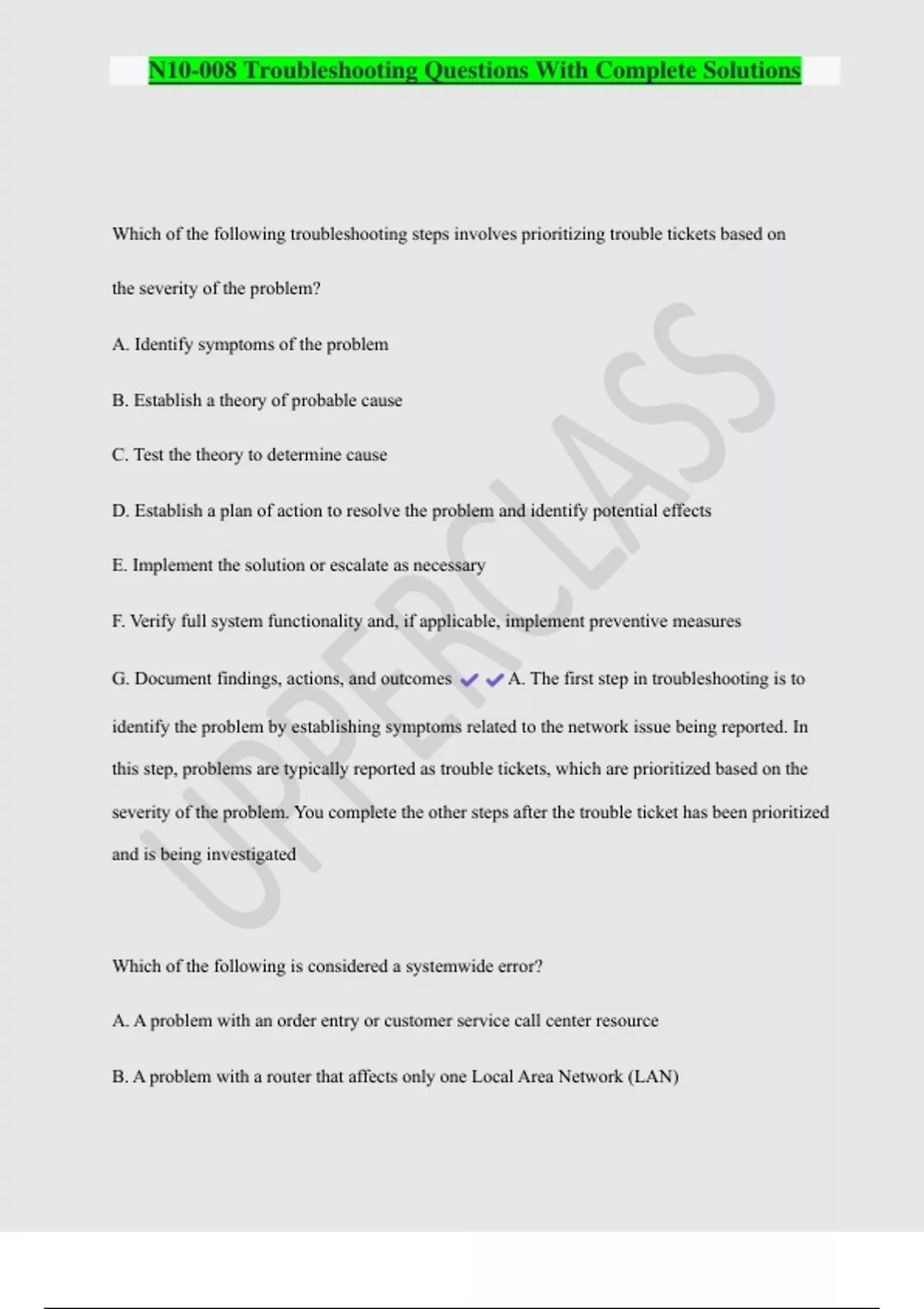 N10-008 Troubleshooting Questions With Complete Solutions Which of the following troubleshooting steps involves prioritizing trouble tickets based on the severity of the problem? A. Identify symptoms of the problem B. Establish a theory of probable cause C. Test the theory to determine cause D. Establish a plan of action to resolve the problem and identify potential effects E. Implement the solution or escalate as necessary F. Verify full system functionality and, if applicable, implement preventive measures G. Document findings, actions, and outcomes A. The first step in troubleshooting is to identify the problem by establishing symptoms related to the network issue being reported. In this step, problems are typically reported as trouble tickets, which are prioritized based on the severity of the problem. You complete the other steps after the trouble ticket has been prioritized and is being investigated