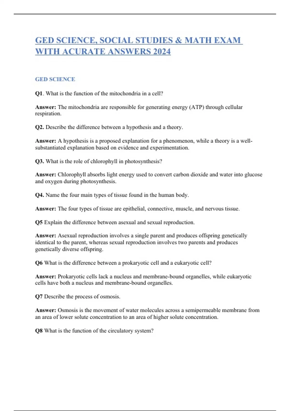 GED SCIENCE, SOCIAL STUDIES & MATH EXAM WITH ACURATE ANSWERS 2024 GED SCIENCE Q1. What is the function of the mitochondria in a cell? Answer: The mitochondria are responsible for generating energy (ATP) through cellular respiration. Q2. Describe the difference between a hypothesis and a theory. Answer: A hypothesis is a proposed explanation for a phenomenon, while a theory is a well-substantiated explanation based on evidence and experimentation. Q3. What is the role of chlorophyll in photosynthesis?