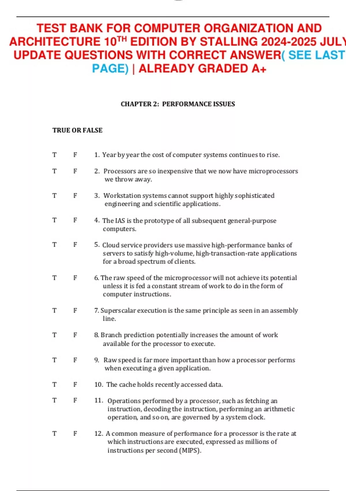 TEST BANK FOR COMPUTER ORGANIZATION AND ARCHITECTURE 10TH EDITION BY STALLING JULY UPDATE QUESTIONS WITH CORRECT ANSWER( SEE LAST PAGE) | ALREADY GRADED A+