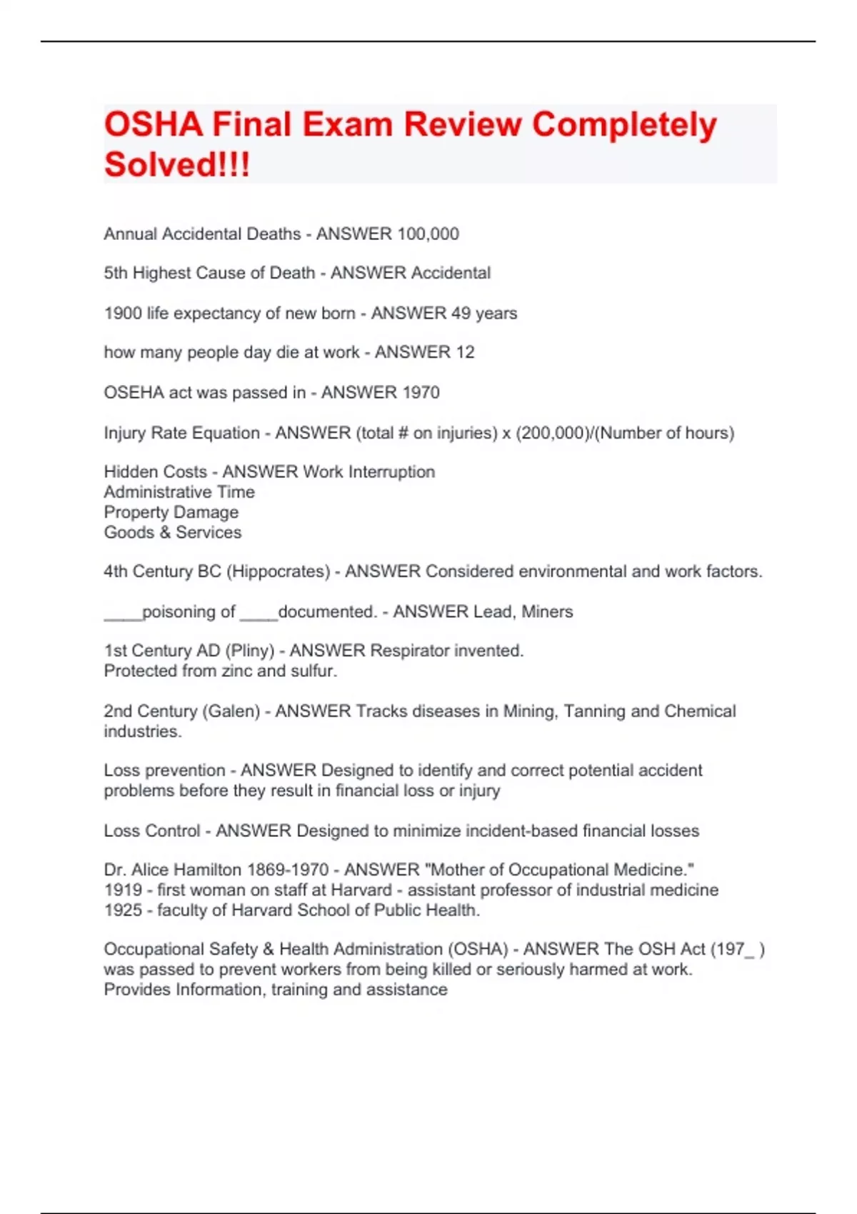 Annual Accidental Deaths - ANSWER 100,000 5th Highest Cause of Death - ANSWER Accidental 1900 life expectancy of new born - ANSWER 49 years how many people day die at work - ANSWER 12 OSEHA act was passed in - ANSWER 1970
