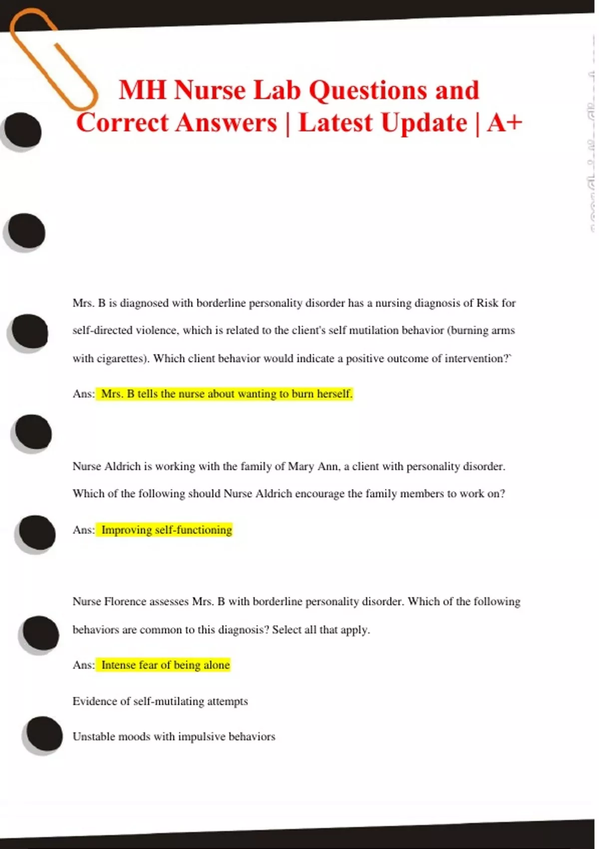Mrs. B is diagnosed with borderline personality disorder has a nursing diagnosis of Risk for self-directed violence, which is related to the client's self mutilation behavior (burning arms with cigarettes). Which client behavior would indicate a positive outcome of intervention?` Ans: Mrs. B tells the nurse about wanting to burn herself. Nurse Aldrich is working with the family of Mary Ann, a client with personality disorder. Which of the following should Nurse Aldrich encourage the family members to work on? Ans: Improving self-functioning Nurse Florence assesses Mrs. B with borderline personality disorder. Which of the following behaviors are common to this diagnosis? Select all that apply. Ans: Intense fear of being alone Evidence of self-mutilating attempts Unstable moods with impulsive behaviors When a client with personality disorder begins demonstrating manipulative behavior, which of the following nursing actions are most appropriate? Select all that apply. Ans: A. Ask the client to think about the consequences of behavior. C. Develop a consistent team approach to handle the client's behaviors. E. Provide immediate feedback concerning the client's specific behaviors. F. Set limits in a clear, direct manner. Barbara is a client with borderline personality disorder. She is defensive and emotionally labile and often becomes suddenly and explosively angry. When interacting with her, you as nurse would: Ans: take a calm, quiet, and non confrontational approach, and avoid arguing with Barbara. Nurse Danita is working with clients who have personality disorders. Which of the following techniques would the nurse use to deal with her own feelings that interfere with therapeutic performance? Ans: Seeking peer or supervisor direction A client with antisocial personality disorder was admitted in a unit at Nurseslabs Hospital. The newly admitted client stole money from an elderly in the unit. Which of the following is the most appropriate for the nurse to say to this client? Ans: "The consequences of stealing are loss of privileges." Angela has a history of conflict-filled relationships. Despite an expressed desire for friends, she acts in ways that tend to alienate people. Which nursing intervention would be important for Angela? Ans: Establish a therapeutic relationship in which the nurse uses role-modeling and roleplaying for appropriate behaviors. Tyrion describes himself as "very religious, with strong opinions about what is right and what is wrong." He is quite judgmental about beliefs and lifestyles that are "unacceptable." Which statement supports the nurse's analysis that this client's behavior is typical of someone with a personality disorder? Ans: Inflexible behaviors, along with use of rigid defense mechanisms, are characteristic. Which statement about an individual with personality disorder is true? Ans: The individual typically remains in the mainstream of society, although he has problems in social and occu