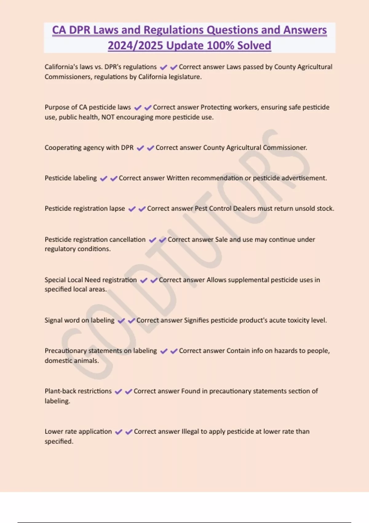 CA DPR Laws and Regulations Questions and Answers 2024/2025 Update 100% Solved California's laws vs. DPR's regulations Correct answer Laws passed by County Agricultural Commissioners, regulations by California legislature. Purpose of CA pesticide laws Correct answer Protecting workers, ensuring safe pesticide use, public health, NOT encouraging more pesticide use. Cooperating agency with DPR Correct answer County Agricultural Commissioner. Pesticide labeling Correct answer Written recommendation or pesticide advertisement. Pesticide registration lapse Correct answer Pest Control Dealers must return unsold stock. Pesticide registration can