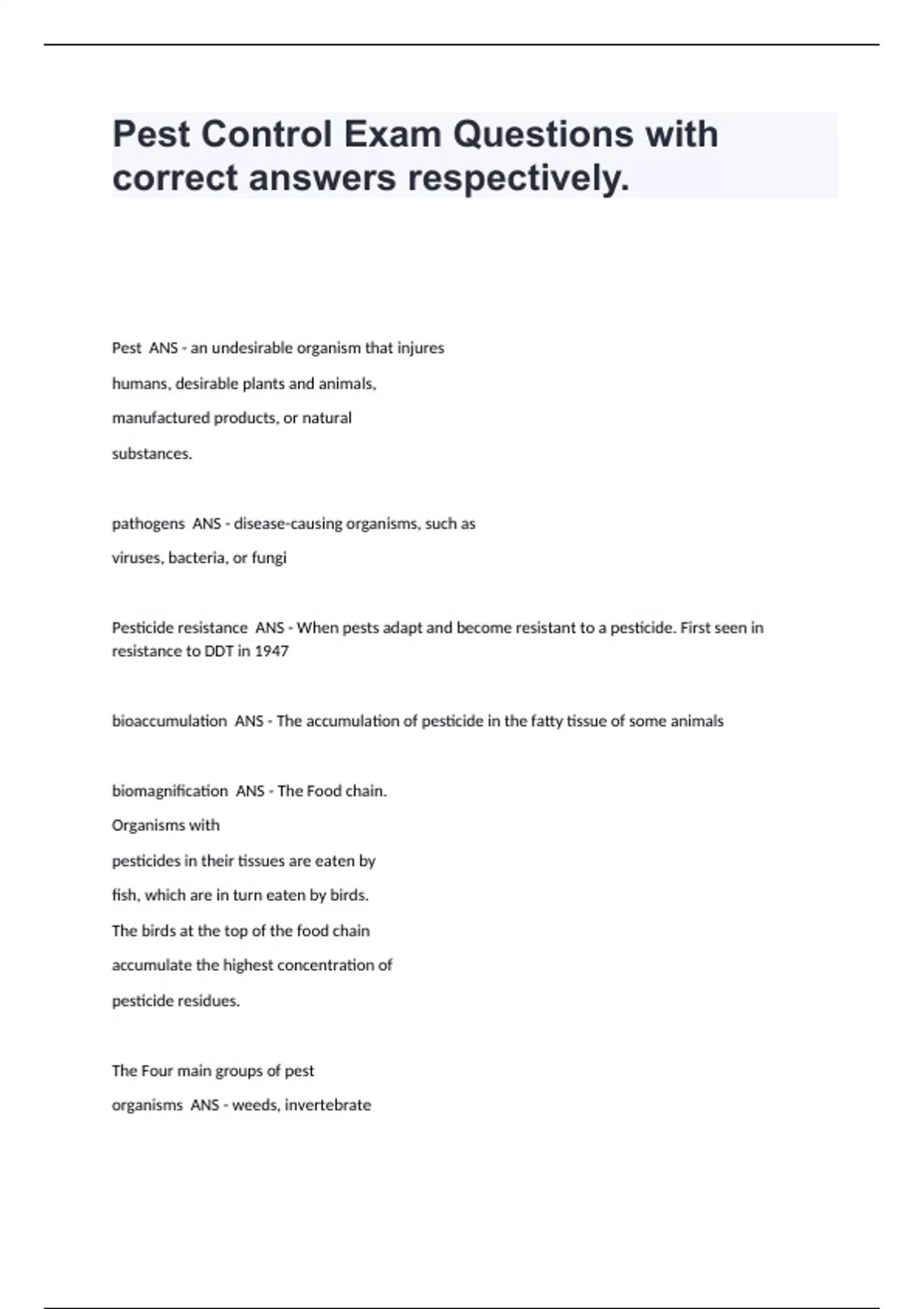 Pest Control Exam Questions with correct answers respectively.