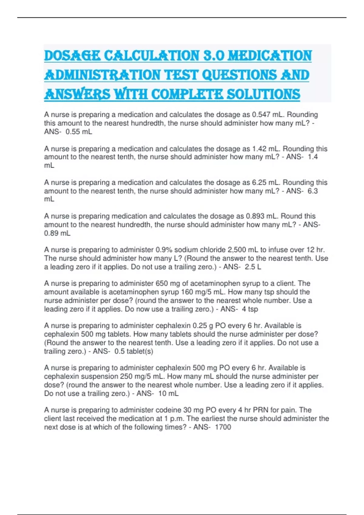 Dosage Calculation 3.0 Medication Administration Test Questions and Answers with complete solutions