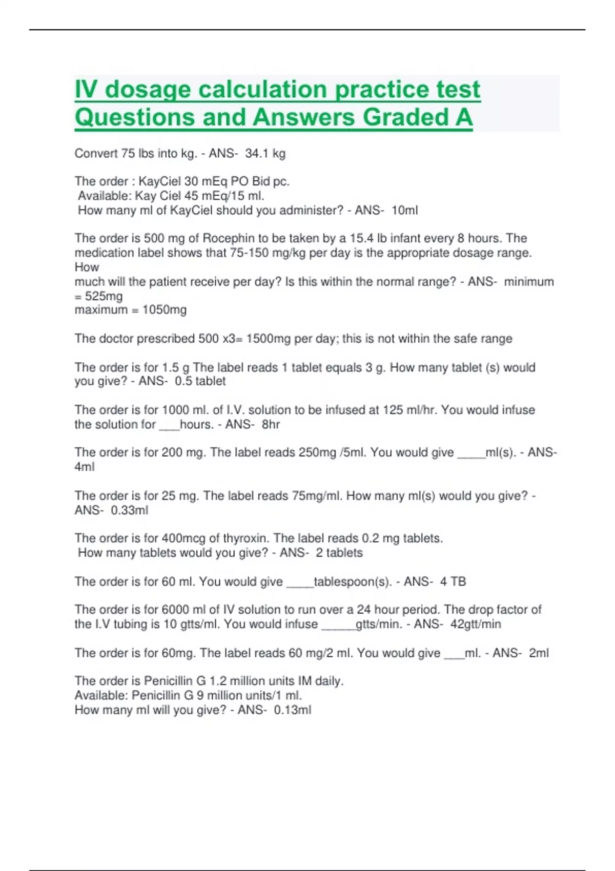 IV dosage calculation practice test Questions and Answers Graded A Convert 75 lbs into kg. - ANS- 34.1 kg The order : KayCiel 30 mEq PO Bid pc. Available: Kay Ciel 45 mEq/15 ml. How many ml of KayCiel should you administer? - ANS- 10ml The order is 500 mg of Rocephin to be taken by a 15.4 lb infant every 8 hours. The medication label shows that 75-150 mg/kg per day is the appropriate dosage range. How much will the patient receive per day? Is this within the normal range? - ANS- minimum = 525mg maximum = 1050mg The doctor prescribed 500 x3= 1500mg per day; this is not within the safe range The order is for 1.5 g The label reads 1 tablet equals 3 g. How many tablet (s) would you give? - ANS- 0.5 tablet The order is for 1000 ml. of I.V. solution to be infused at 125 ml/hr. You would infuse the solution for ___hours. - ANS- 8hr The order is for 200 mg. The label reads 250mg /5ml. You would give ____ml(s). - ANS- 4ml The order is for 25 mg. The label reads 75mg/ml. How many ml(s) would you give? - ANS- 0.33ml The order is for 400mcg of thyroxin. The label reads 0.2 mg tablets. How many tablets would you give? - ANS- 2 tablets The order is for 60 ml. You would give ____tablespoon(s). - ANS- 4 TB The order is for 6000 ml of IV solution to run over a 24 hour period. The drop factor of the I.V tubing is 10 gtts/ml. You would infuse _____gtts/min. - ANS- 42gtt/min The order is for 60mg. The label reads 60 mg/2 ml. You would give ___ml. - ANS- 2ml The order is Penicillin G 1.2 million units IM daily. Available: Penicillin G 9 million units/1 ml. How many ml will you give? - ANS- 0.13ml The order is Solumedrol 3mg/kg for a child weighing 20kg. Solumedrol is available as 125 mg / 2 ml. How many ml must the nurse administer? - ANS- 0.96ml Your patient weighs 75 kg and you are ordered to infuse 250 mg dobutamine in 500 ml NS at 10 mcg/kg/min. How many MILLIGRAMS of dobutamine will infuse per hour? - ANS- 45mg/hr
