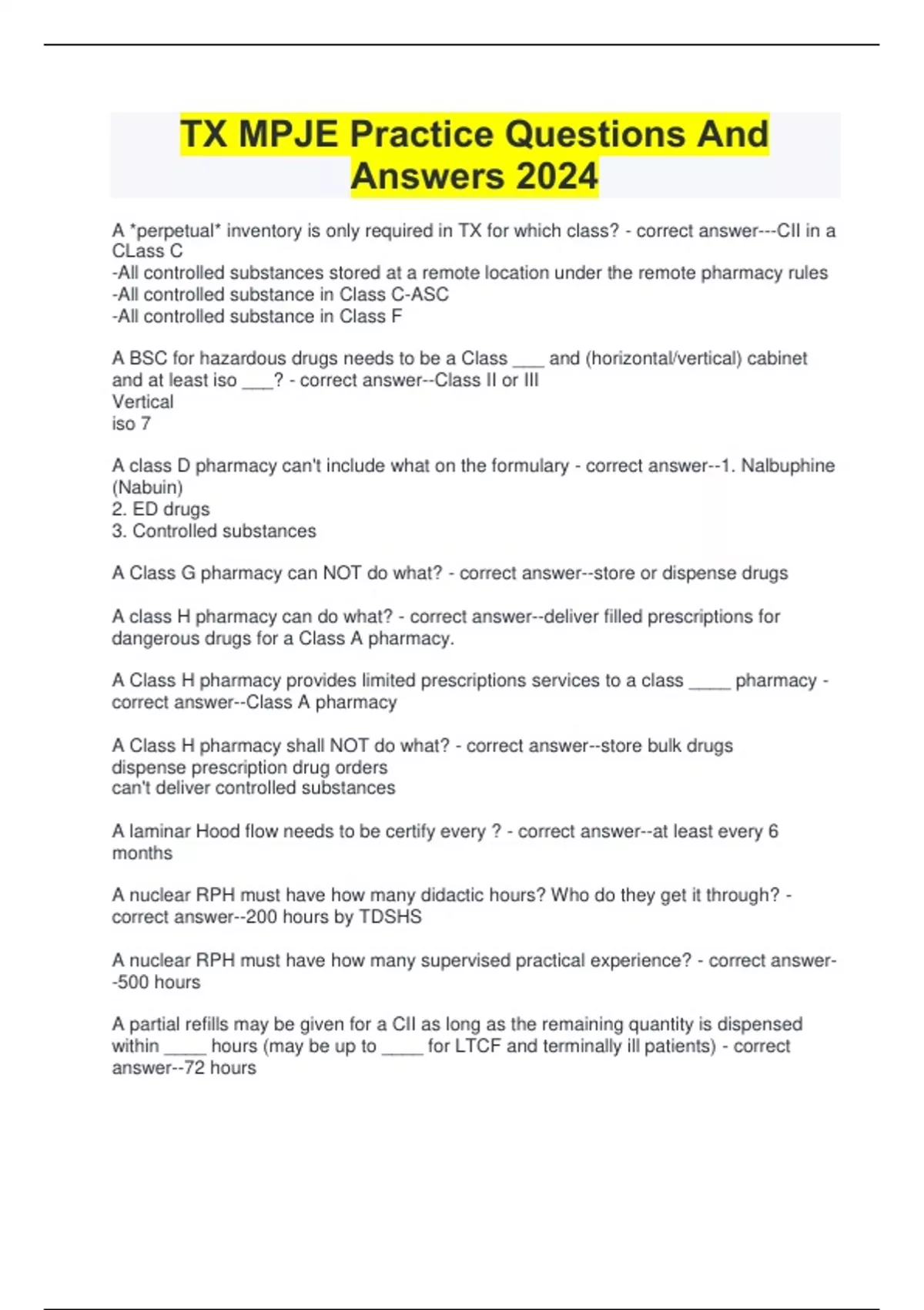 A *perpetual* inventory is only required in TX for which class? - correct answer---CII in a CLass C -All controlled substances stored at a remote location under the remote pharmacy rules -All controlled substance in Class C-ASC -All controlled substance in Class F A BSC for hazardous drugs needs to be a Class ___ and (horizontal/vertical) cabinet and at least iso ___? - correct answer--Class II or III Vertical iso 7 A class D pharmacy can't include what on the formulary - correct answer--1. Nalbuphine (Nabuin) 2. ED drugs 3. Controlled substances A Class G pharmacy can NOT do what? - correct answer--store or dispense drugs A class H pharmacy can do what? - correct answer--deliver filled prescriptions for dangerous drugs for a Class A pharmacy. A Class H pharmacy provides limited prescriptions services to a class ____ pharmacy - correct answer--Class A pharmacy A Class H pharmacy shall NOT do what? - correct answer--store bulk drugs dispense prescription drug orders can't deliver controlled substances A laminar Hood flow needs to be certify every ? - correct answer--at least every 6 months A nuclear RPH must have how many didactic hours? Who do they get it through? - correct answer--200 hours by TDSHS A nuclear RPH must have how many supervised practical experience? - correct answer- -500 hours A partial refills may be given for a CII as long as the remaining quantity is dispensed within ____ hours (may be up to ____ for LTCF and terminally ill patients) - correct answer--72 hours