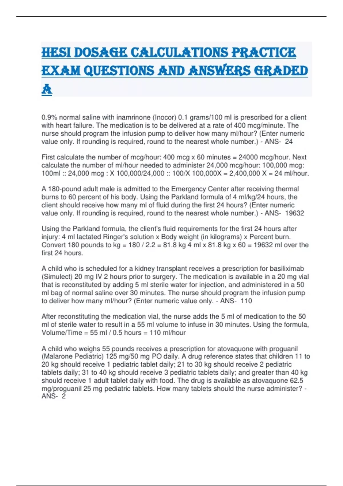 HESI Dosage Calculations Practice Exam Questions and Answers Graded A