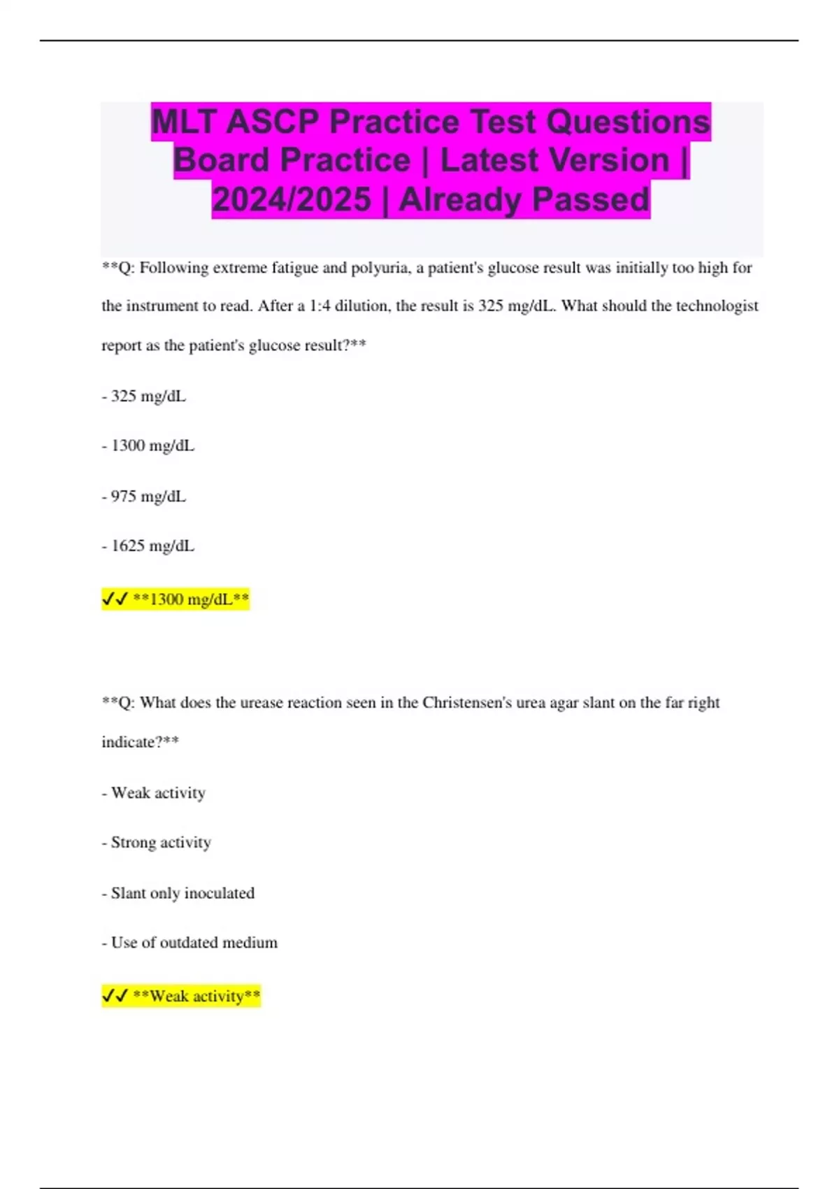 MLT ASCP Practice Test Questions Board Practice | Latest Version | 2024/2025 | Already Passed **Q: Following extreme fatigue and polyuria, a patient's glucose result was initially too high for the instrument to read. After a 1:4 dilution, the result is 325 mg/dL. What should the technologist report as the patient's glucose result?** - 325 mg/dL - 1300 mg/dL - 975 mg/dL - 1625 mg/dL **1300 mg/dL** **Q: What does the urease reaction seen in the Christensen's urea agar slant on the far right indicate?** - Weak activity - Strong activity - Slant only inoculated - Use of outdated medium **Weak activity** **Q: What is the initial step of the PCR reaction?** - Hybridization - Extension - Annealing - Denaturation **Denaturation** **Q: What is the concentration of sodium chloride in an isotonic solution?** - 8.5% - 0.85% - 0.08% - 1 molar **0.85%** **Q: Which laboratory results are typically seen in a patient with acute Disseminated Intravascular Coagulation (DIC)?** - Prolonged PT, elevated platelet count, decreased FDP - Normal PT, decreased fibrinogen, decreased platelet count, decreased FDP - Prolonged PT, decreased fibrinogen, decreased platelet count, increased FDP - Normal PT, decreased platelet count, decreased FDP **Prolonged PT, decreased fibrinogen, decreased platelet count, increased FDP** **Q: What dilution is commonly used for routine sperm count analysis?** - 1:2 - 1:20 - 1:200 - 1:400 **1:20**