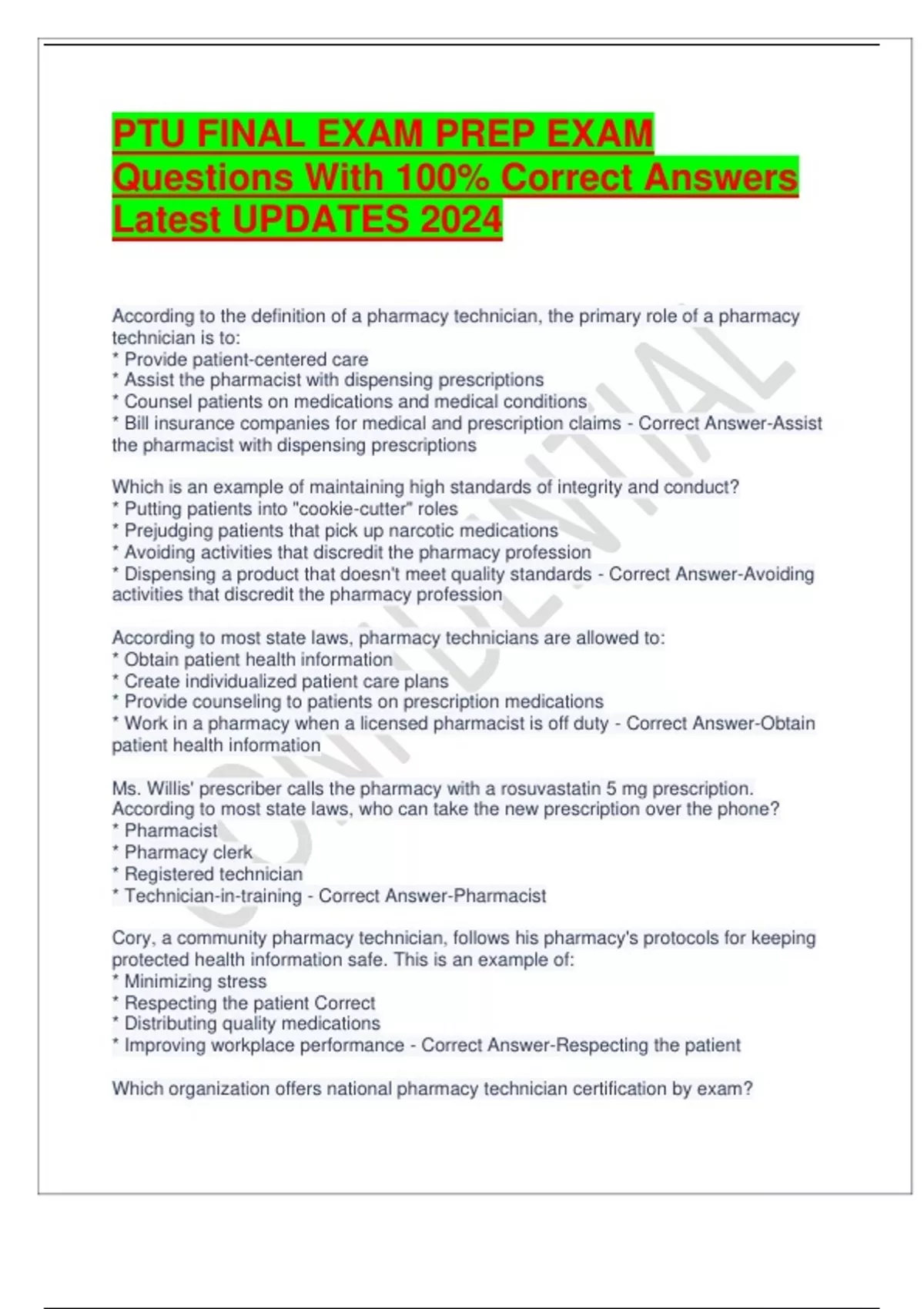PTU FINAL EXAM PREP EXAM Questions With 100% Correct Answers Latest UPDATES 2024 According to the definition of a pharmacy technician, the primary role of a pharmacy technician is to: * Provide patient -centered care * Assist the pharmacist with dispensing prescriptions * Counsel patients on medications and medical conditions * Bill insurance companies for medical and prescription claims - Correct Answer -Assist the pharmacist with dispensing prescriptions Which is an example of maintaining high standards of integrity and conduct? * Putting patients into "cookie -cutter" roles * Prejudging patients that pick up narcotic medications * Avoiding activities that discredit the pharmacy profession * Dispensing a product that doesn't meet quality standards - Correct Answer -Avoiding activities that discredit the pharmacy profession According to most state laws, pharmacy technicians are allowed to: * Obtain patient health information * Create individualized patient care plans * Provide counseling to patients on prescription medications * Work in a pharmacy when a licensed pharmacist is off duty - Correct Answer -Obtain patient health information Ms. Willis' prescriber calls the pharmacy with a rosuvastatin 5 mg prescription. According to most state laws, who can take the new prescription over the phone? * Pharmacist * Pharmacy clerk * Registered technician * Technician -in-training - Correct Answer -Pharmacist Cory, a community pharmacy technician, follows his pharmacy's protocols for keeping protected health information safe. This is an example of: * Minimizing stress * Respecting the patient Correct * Distributing quality medications * Improving workplace performance - Correct Answer -Respecting the patient Which organization offers national pharmacy technician certification by exam? * DEA * FDA * NHA * PTA - Correct Answer -NHA According to most state laws, a community pharmacy technician is allowed to: * Gather insurance information from a patient * Counsel patients on over -the-counter medications * Perform the final check of a completed prescription * Take a refill prescription with changes from a prescriber over the phone - Correct Answer -Gather insurance information from a patient In which pharmacy setting is a technician most likely to maintain floor stock? * Community * Hospital * Long -term care * Mail -order - Correct Answer -Hospital Pharmacists' Patient Care Process uses which type of approach in providing care? * Patient -centered * Pharmacist -centered * Physician -centered *Provider -centered - Correct Answer -Patient -centered In which setting is a technician most likely to fill med cards? * Community * Hospital * Long -term care * Nuclear - Correct Answer -Long -term care A pharmacy intern is someone who is: * Studying to become a pharmacist Correct * Studying to earn a bachelor's degree * A technician on an experiential rotation * A high school student completing volunteer hours - Correct Answer -Studying to become a pharmacist Which is an example of nonverbal communication? * Following dress code * Understanding computer basics * Using appropriate body language * Knowing word processing software - Correct Answer -Using appropriate body language In which pharmacy practice setting does the majority of pharmacy technicians work? * Correctional facilities * Long -term care facilities * Mail -order pharmacies * Retail pharmacies - Correct Answer -Retail pharmacies Mr. Peterson brings in a prescription for promethazine syrup. What is one of your main roles as a pharmacy technician? * Complete the final check on Mr. Peterson's prescription * Determine the appropriateness and safety of Mr. Peterson's prescription * Gather a list of Mr. Peterson's current medications and medical conditions * Counsel Mr. Peterson on the precautions and side effects of his medication - Correct Answer -Gather a list of Mr. Peterson's current medications and medical conditions Gather a list of Mr. Peterson's current medications and medical conditions * Maintain and refill crash carts * Counsel patients on prescription medications * Perform the final check of a filled med for accuracy * Take a new med order from a prescriber over the phone - Correct Answer -Maintain and refill crash carts In which setting is a technician most likely to assist patients at drop -off? * Community * Long -term care * Mail -order * Nuclear - Correct Answer -Community Which duty is a nuclear pharmacy technician most likely to perform? * Advise on OTC meds * Prepare emergency kits * Assist in patient drop -off * Handle radioactive products - Correct Answer -Handle radioactive products One quality of an effective pharmacy technician is to: * Increase workload * Work as an individual * Adapt to change quickly * Minimize body language - Correct Answer -Adapt to change quickly Ms. Garza is given raloxifene 60 mg tablets. According to most state laws, which duty can a long -term pharmacy technician perform? * Prepare Ms. Garza's med pack * Ring up Ms. Garza's prescription * Counsel Ms. Garza on drug interactions * Send Ms. Garza's prescription through the mail - Correct Answer -Prepare Ms. Garza's med pack A pharmacy technician who has listed with their state Board of Pharmacy for the sole purpose of tracking is considered: * Accredited * Certified * Licensed * Registered - Correct Answer -Registered Mr. Okafor takes lamotrigine 100 mg. According to most state laws, as a mail -order pharmacy technician, you will: * Perform the final check of Mr. Okafor's lamotrigine order * Prepare the radioactive medication needed for Mr. Okafor's brain scan * Have a face -to-face interaction with Mr. Okafor each time he gets a refill * Prepare Mr. Okafor's lamotrigine order so that it can be delivered to his home - Correct Answer -Prepare Mr. Okafor's lamotrigine order so that it can be delivered to his home Which is a limitation to package inserts? The print is very small They fall off of drug bottles They take a long time to update They use nont