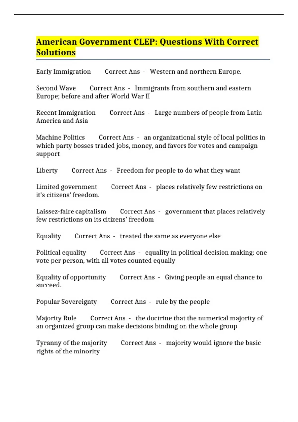 American Government CLEP: Questions With Correct Solutions